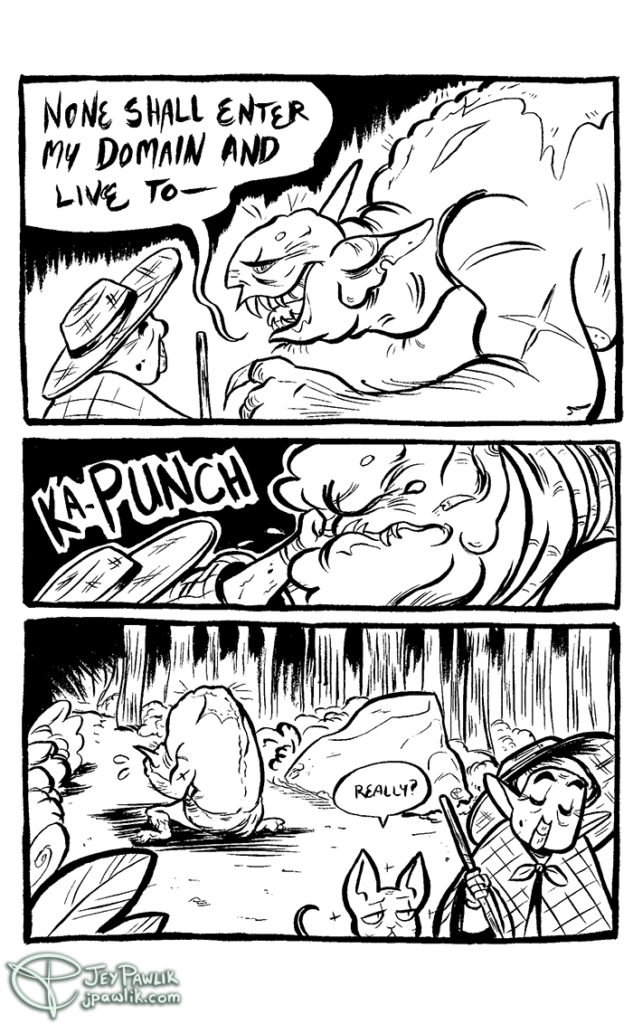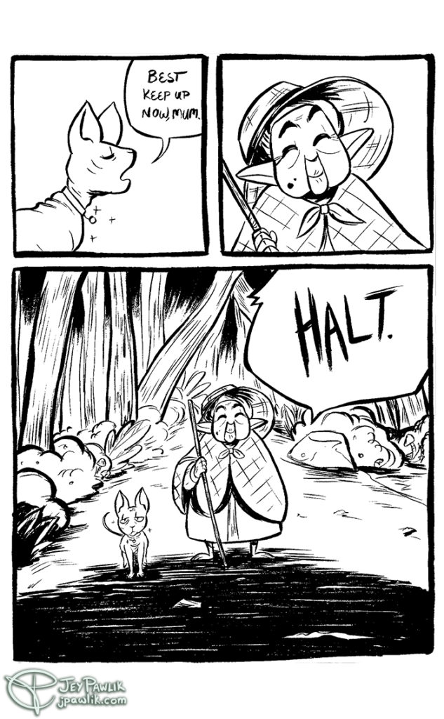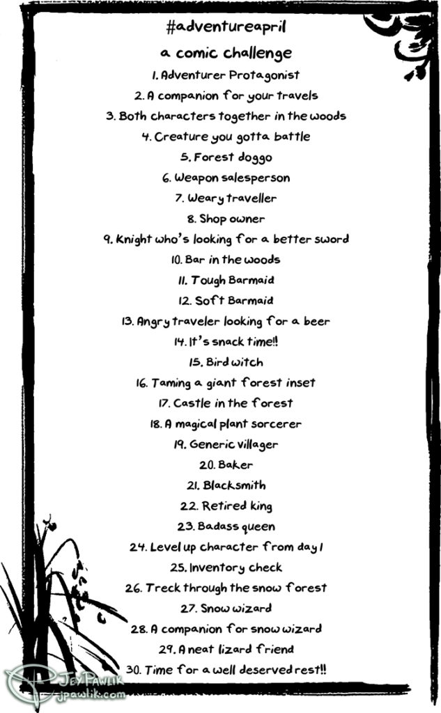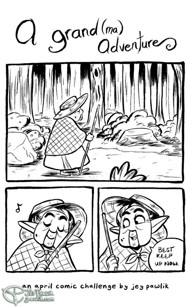 For an April comics challenge, Jey used a prompt list and draws one page of a comic every day for a month. The end result is an elderly lady goes on an adventure through a D&D inspired forest in this 31 page comic.