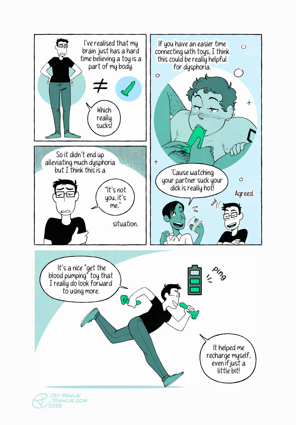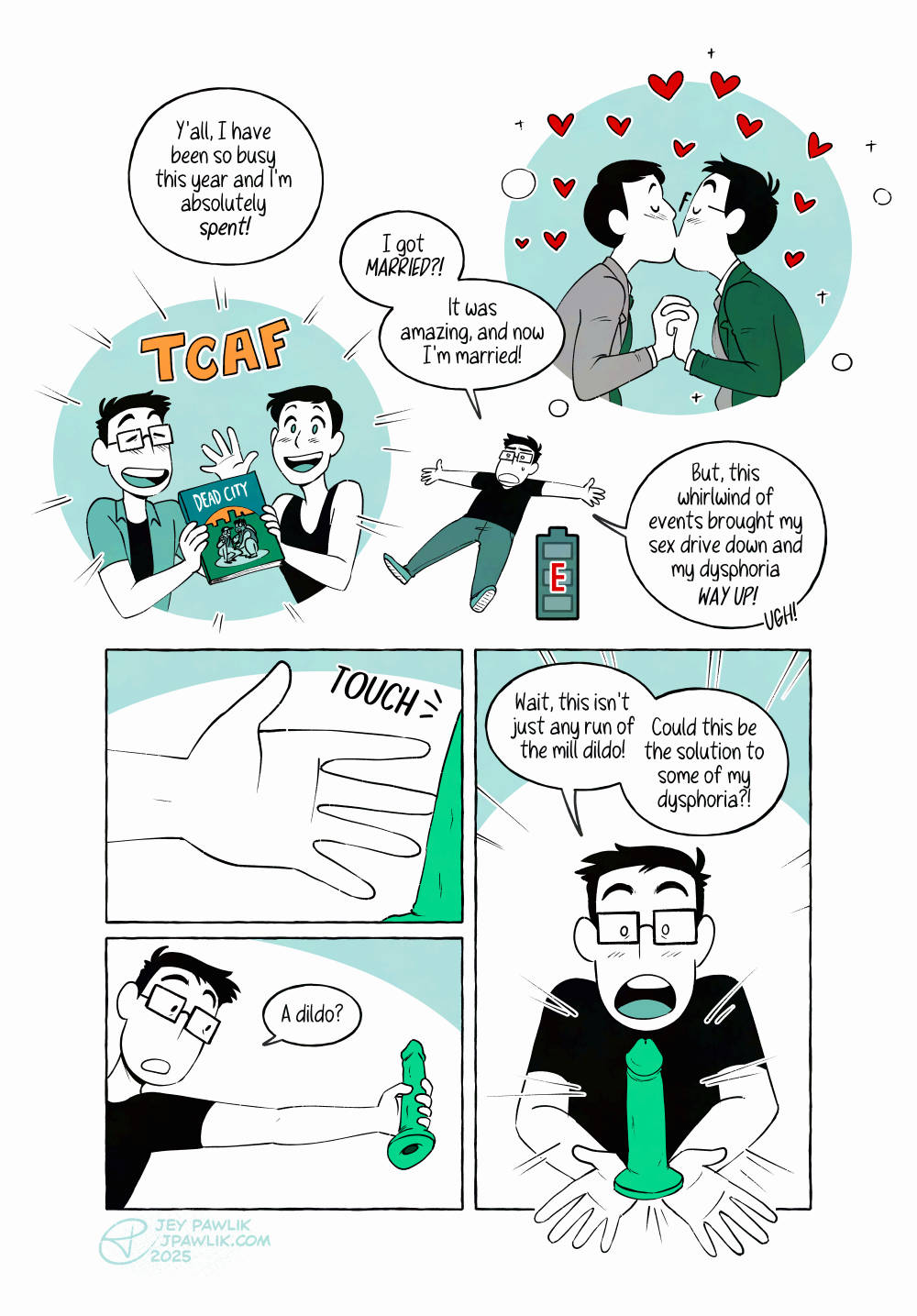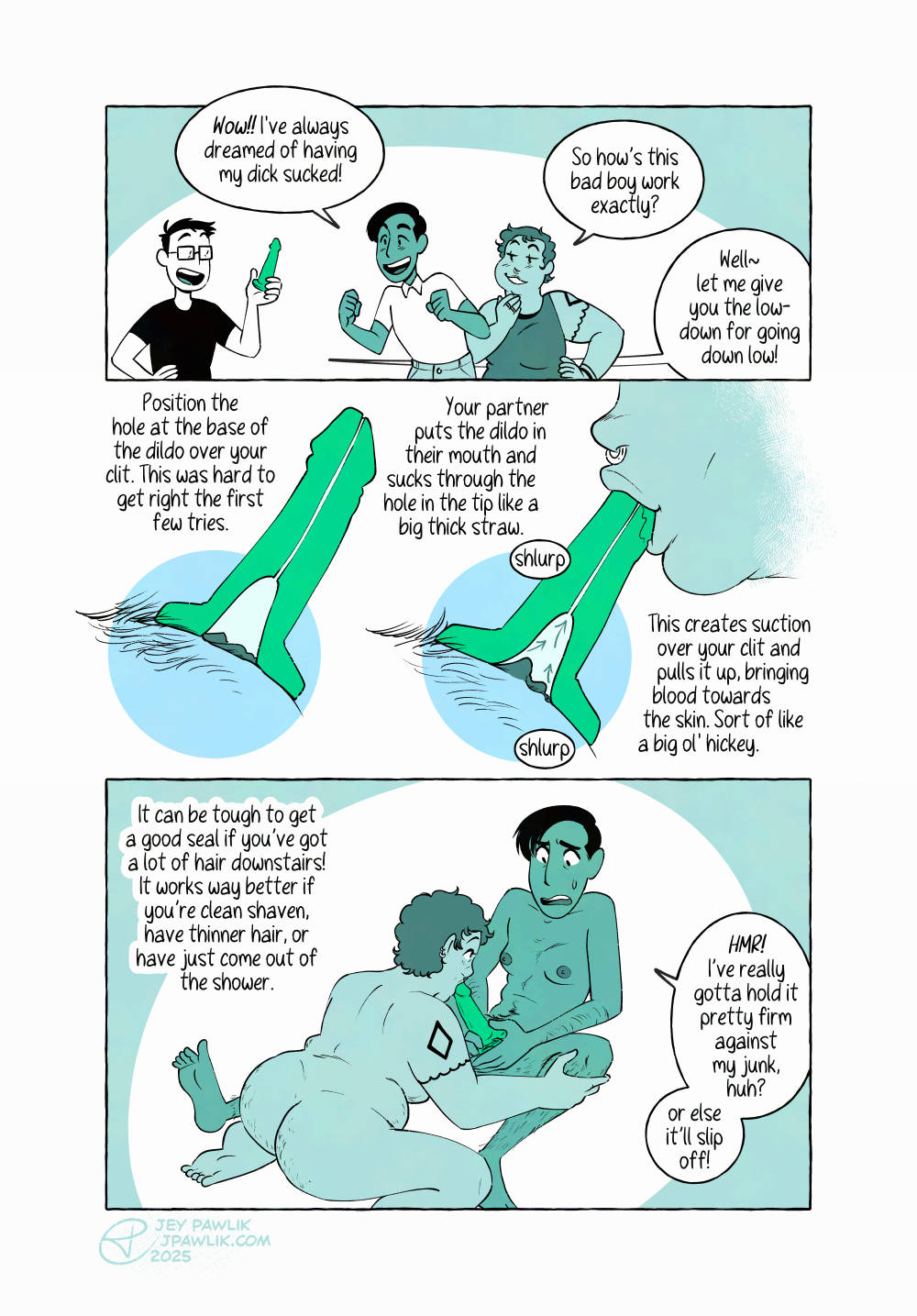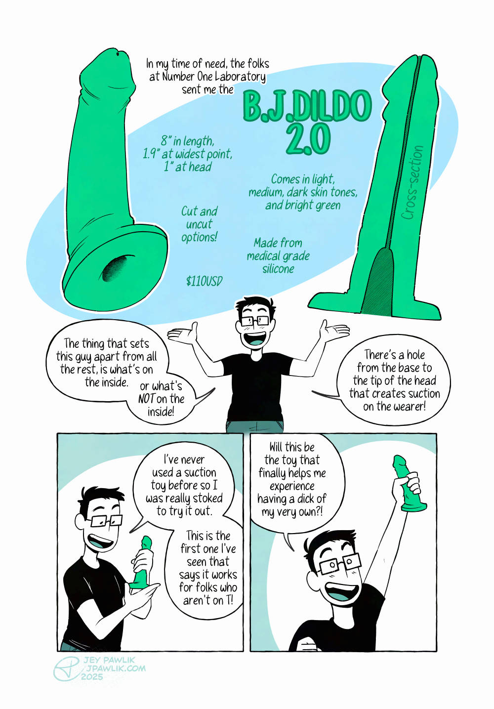 A review comic for the BJ Dildo 2.0, a toy that, you guessed it, simulates a BJ. A 5 page comic for Oh Joy Sex Toy.