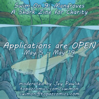 Forgot to post my Swim On pieces from last year’s zine! I drew some guitarfish (which are technically sharks but also rays), and then a collab with my nephew of a great white he drew (I cleaned it up, coloured and did the background). If you missed it, be sure to check out the Swim On zine I run every year!