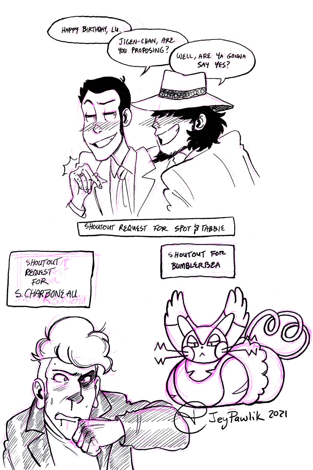 Sketchbook Shoutouts – 38 Nov 3, 2023Nov 4, 2024 FanartAll Art (without update posts)CommissionsLupin III jigengoemonzenigatathe curtain fallsshoutoutlupinzenigatashoutout requestloopzoopjigenlupingoemon Some very good shoutouts from the $10 gang on Patreon! Related Posts Holla Holla Apr 23, 2021Jun 15, 2021 Sketchbook Shoutout – 10 Sep 3, 2021Jun 30, 2021 Sketchbook Shoutouts – 73 Jan 2, 2026Dec 5, 2025 Search for: Grid View Topaz Comics LatestFebruary 2026 NewsletterIns and Outs of Webcomics REMASTER – 5Ins and Outs of Webcomics REMASTER – 4 OJST LatestGender Goals by Jey PawlikSelling Sexy Comics, An Hourly Comic by Jey PawlikT With A Side Of POP by Jey PawlikCategories All Art (without update posts) Alola Darumaka Anthologies & Zines Comics Commissions Dead City Fanart ISO Lupin III Original Characters Photography Q&A The Curse Eater Updates VIP Archives Archives Select Month March 2026 February 2026 January 2026 December 2025 November 2025 October 2025 September 2025 August 2025 July 2025 June 2025 May 2025 April 2025 March 2025 February 2025 January 2025 December 2024 November 2024 October 2024 September 2024 August 2024 July 2024 June 2024 May 2024 April 2024 March 2024 February 2024 January 2024 December 2023 November 2023 October 2023 September 2023 August 2023 July 2023 June 2023 May 2023 April 2023 March 2023 February 2023 January 2023 December 2022 November 2022 October 2022 September 2022 August 2022 July 2022 June 2022 May 2022 April 2022 March 2022 February 2022 January 2022 December 2021 November 2021 October 2021 September 2021 August 2021 July 2021 June 2021 May 2021 April 2021 March 2021 February 2021 January 2021 December 2020 November 2020 October 2020 September 2020 August 2020 July 2020 June 2020 May 2020 April 2020 March 2020 February 2020 January 2020 December 2019 November 2019 October 2019 September 2019 August 2019 July 2019 June 2019 May 2019 April 2019 March 2019 February 2019 January 2019 December 2018 November 2018 October 2018 September 2018 August 2018 July 2018 June 2018 May 2018 April 2018 March 2018 February 2018 January 2018 December 2017 November 2017 October 2017 September 2017 August 2017 July 2017 June 2017 May 2017 April 2017 March 2017 February 2017 January 2017 December 2016 November 2016 October 2016 September 2016 August 2016 July 2016 June 2016 May 2016 April 2016 March 2016 February 2016 January 2016 December 2015 November 2015 October 2015 September 2015 August 2015 July 2015 June 2015 May 2015 April 2015 March 2015 February 2015 January 2015 November 2014 October 2014 August 2014 July 2014 June 2014 May 2014 April 2014 March 2014 February 2014 January 2014 December 2013 November 2013 October 2013 September 2013 August 2013 July 2013 June 2013 May 2013 April 2013 March 2013 February 2013 January 2013 December 2012 October 2012 September 2012 Jey’s Webcomic Pick
