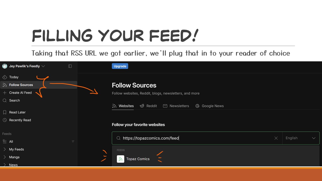 Using Feedly as my example here, we’ll take that RSS URL we got earlier and plug it into “Follow Sources”. This might be a bit different reader to reader, but there will always be some kind of “Input your RSS here” option. Feedly also has a feature where if you don’t have the RSS URL sometimes you can just plug the website in and it will find the feed URL for you — but beware this might not always work or it might give you an outdated one if, say, the person moved hosts or websites. This happened to me a few times when I was first populating my feed and I just didn’t get updates from a comic I followed. Giving it the RSS URL you got from the source the most reliable for sure!