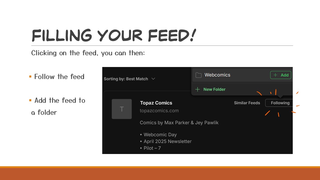 From here on it’s super easy, just clicking the feed you’ll have the option to follow it! I like putting the comics I follow into folders and here’s where you’ll have the chance to do that and organize. I have a folder for webcomics, manga, news, and then a separate folder for my own website feeds.