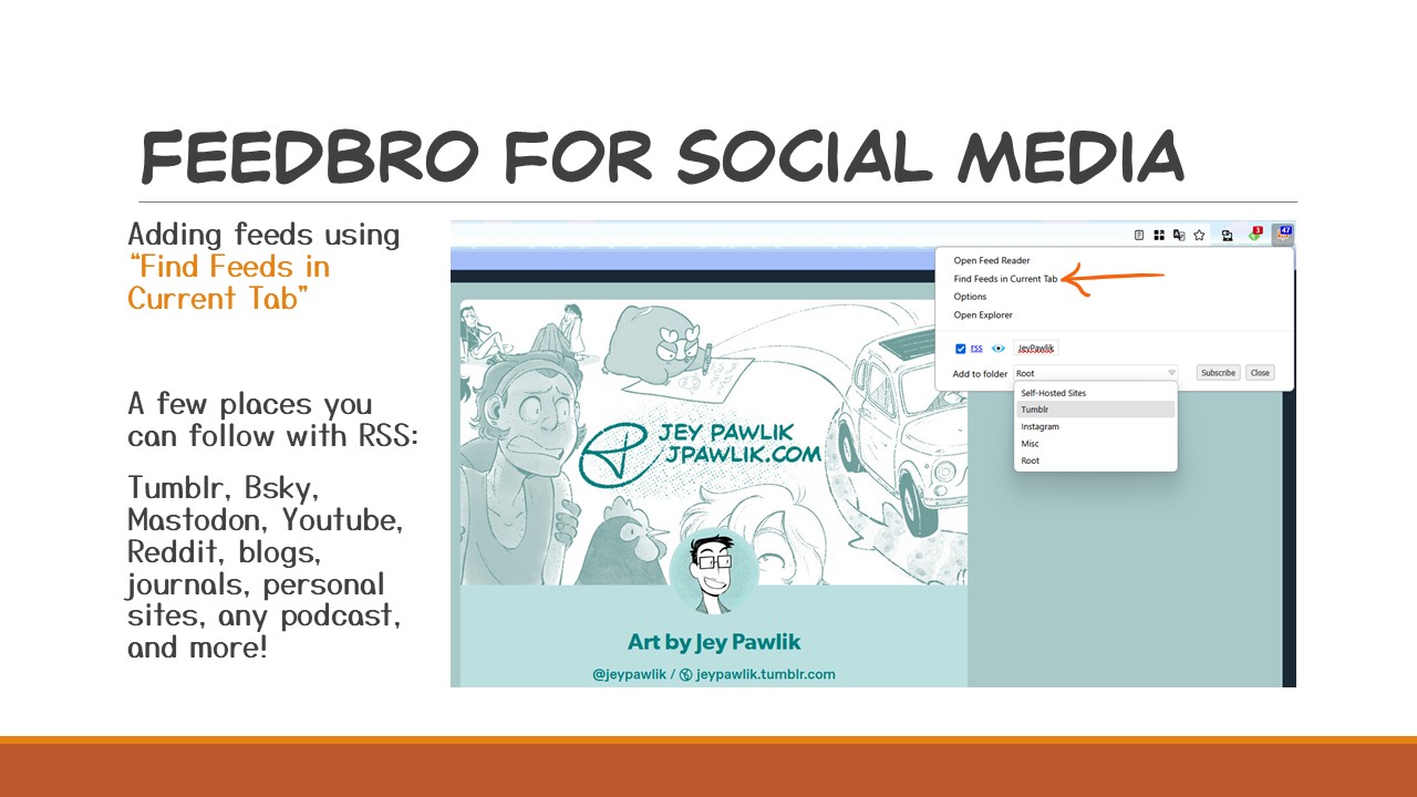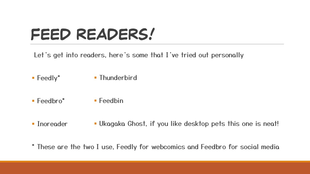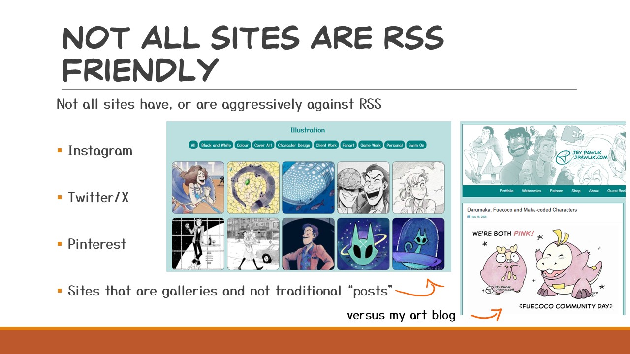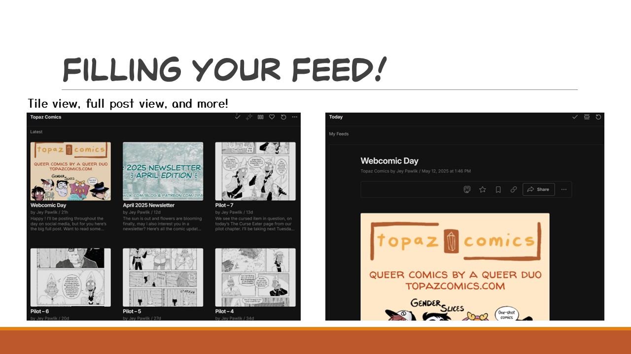 RSS stands for “Really Simple Syndication”, but to put it in simple terms: RSS is an update feed that most websites have by default (I’ll go over those that don’t in a bit) and every time the site publishes a post, article, or comic page the feed is updated. Users can use feed readers to follow RSS feeds which will populate their reader with posts from those websites. The user has complete control over their feed, so when they follow an RSS feed they will get posts ONLY from the sites they follow. There are no ads, data collection, tracking, or algorithm, and it will not show you posts from people you DON’T follow.