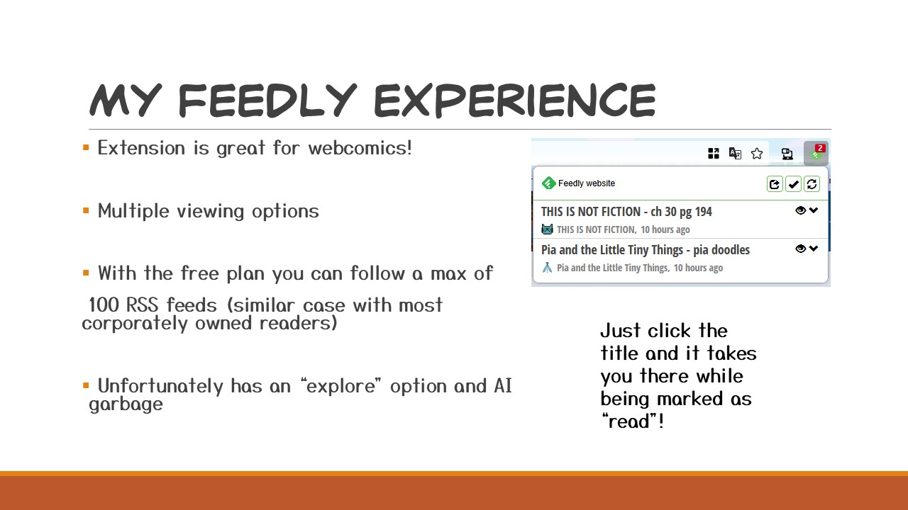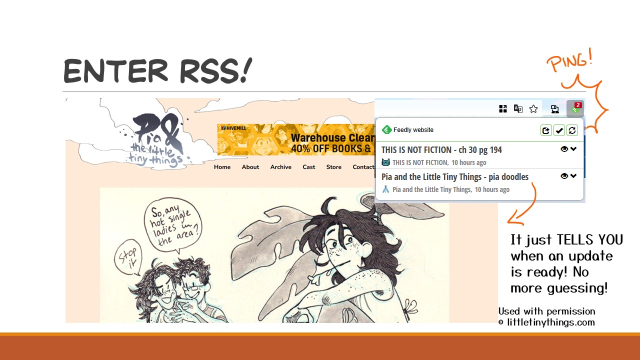 With RSS, I get notifications every time a webcomic updates. Oh, look, there’s two new updates for me. Let me just click on that and I’m sent RIGHT to the latest page. With RSS you can get webcomic, website articles, social media posts, podcasts, and more to a feed you make and control yourself!