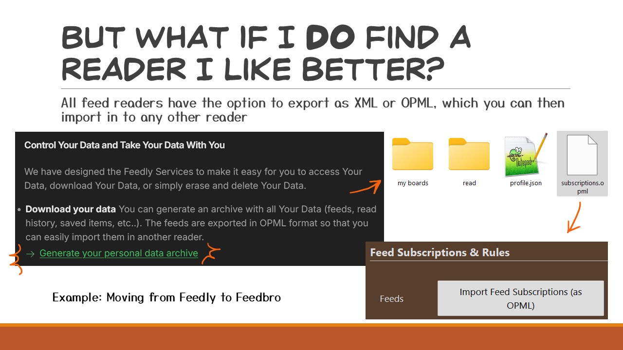 Here’s an example of the two steps it takes to move from Feedly to Feedbro, if I ever wanted to.