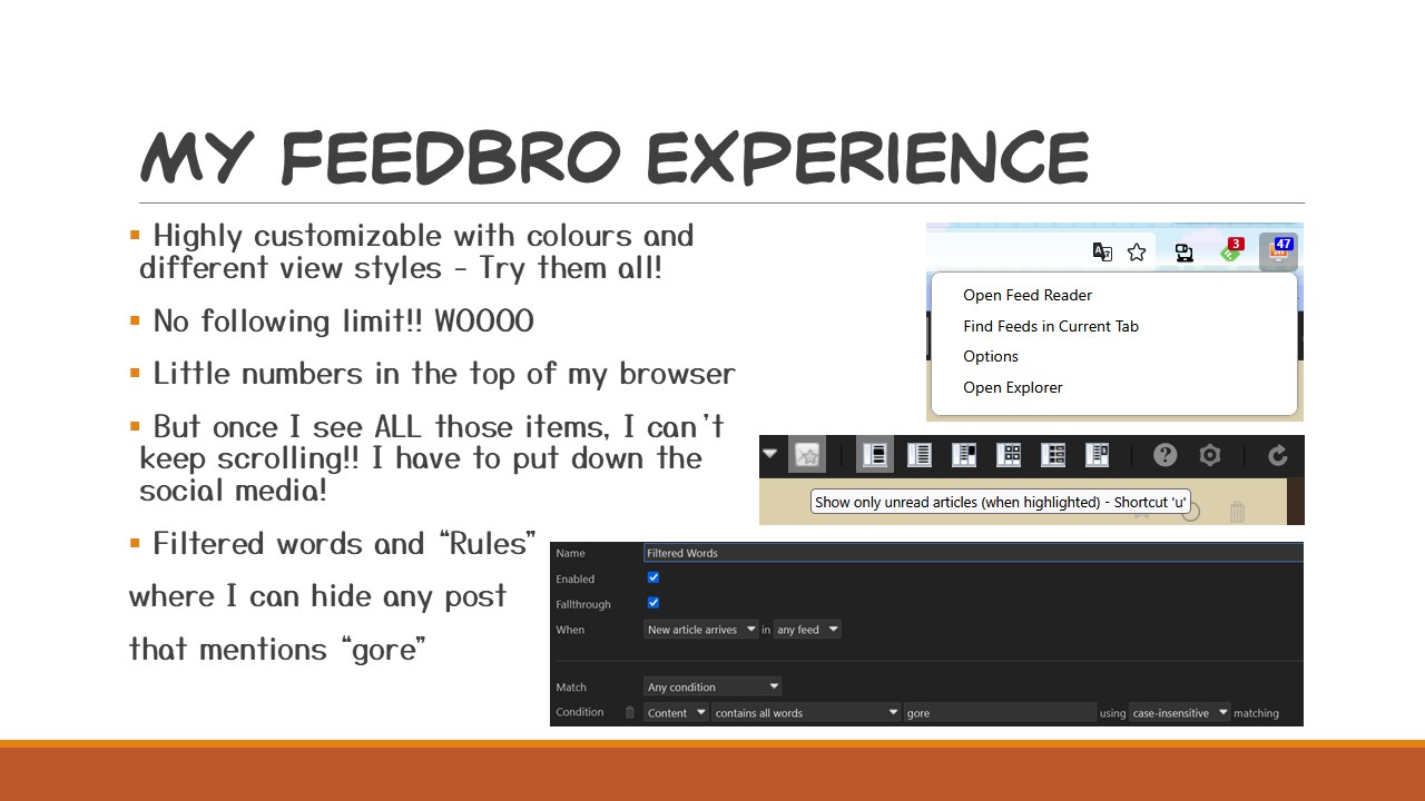 Lastly, I really like the way ‘Rules’ work which are also highly customizable, I can filter certain words either within a post, within a title, or a post-author and have Feedbro auto delete those which is nice for if I want to avoid posts from certain people or say, I’m a bit squeamish so I’ve filtered out any kind of ‘gore’.