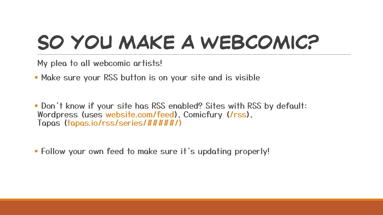 People do use RSS and you’ll be doing them a favour by having it loud and proud, but maybe you don’t know if you have an RSS? WordPress, Comicfury, and Tapas all have RSS by default. You may have to do the URL trick to see what URL your RSS is, and for convenience I’ve included the RSS URL structure for the sites I mentioned. WordPress uses /feed, Comicfury uses /RSS, and Tapas uses tapas.io/RSS/series/yourcomicID