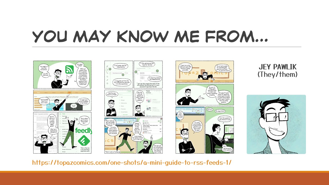 I’m Jey Pawlik and you may know me from that RSS intro comic that I posted in 2022 that kind of exploded! It’s been shared around so much, it’s still getting replies and comments with suggestions and questions. This made me realise that there were a few things I needed to expand upon, there’s only so much you can fit into a 3 page comic after all.