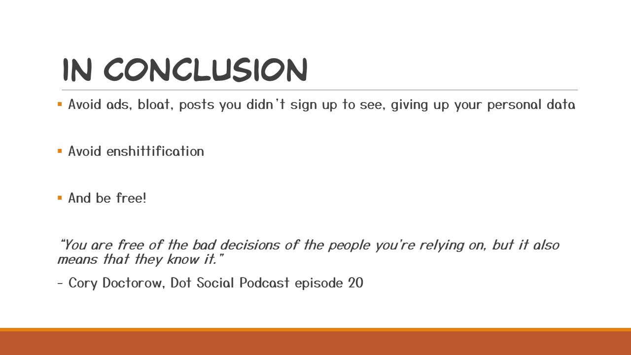 I recently listened to episode 20 of the Dot Social Podcast featuring Cory Doctorow speaking about RSS, which was a big help in writing this talk, other folks running NIF events have mentioned Cory already and his coining of the phrase “enshittification” and I sincerely believe RSS is the way out, I believe RSS can save us from that.