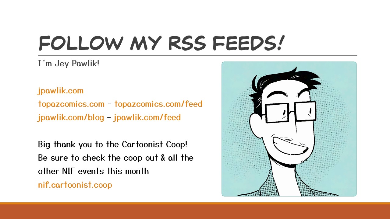 Thank you for reading! And a big thank you to the Cartoonist Coop for giving me this opportunity to chat about RSS to you all.