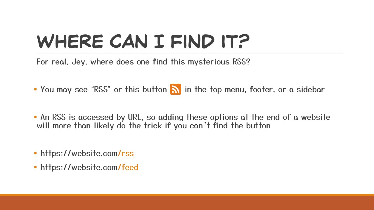 So you’re visiting a webcomic site, you’ve caught up to the latest page and you like it so much you want to follow the RSS feed. In most cases you’ll find it as either the text “RSS” or as the button shown in the slide. These can usually be found in the top menu, footer, or a sidebar. If, for whatever reason, the site you’re using does not have a button anywhere — never fear because RSS is just a URL and you can usually just tack either /RSS, or /feed onto any URL to get the RSS as shown in the slide.