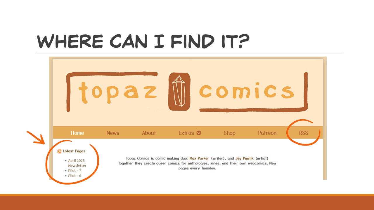 However Neocities does not have RSS enabled by default. Never fear! You can manually add an RSS feed to your Neocities site using this guide at rssguide.neocities.org — and if you use Rarebit for your webcomic, while I believe the previous link only works for standard Neocities sites, you can integrate an RSS feed with Rarebit by following the guide by Vivivi at vivivi.leprd.space/software/rarebit-rss — there’s always an option if RSS isn’t available!