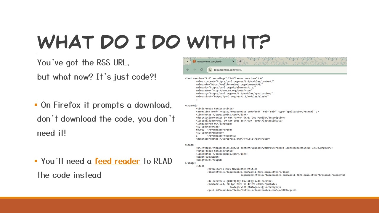 You’ve got the RSS URL but now what? When you click on the button, it just looks like a string of code, or if you’re using Firefox it asks you to download the code — you don’t need to download anything, I promise! This is where feed readers come in and they will read that code for you!