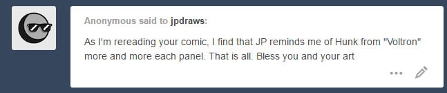 Thank you anon! Though in all honesty, JP’s a much bigger jerk than the cinnamon roll that is Hunk!
