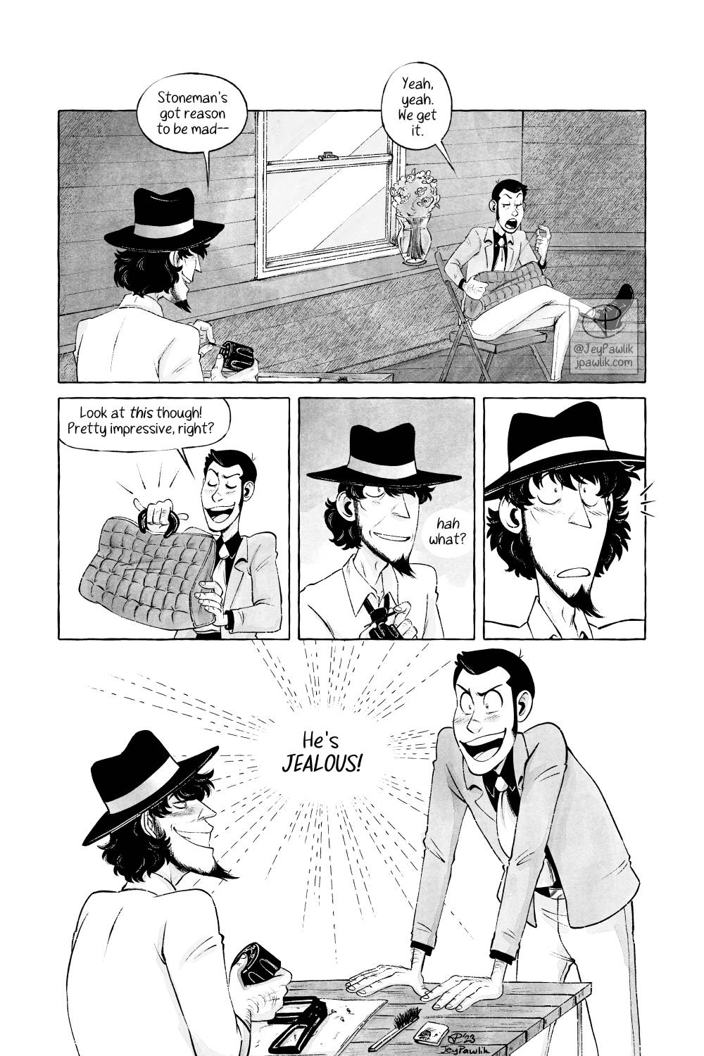 Had this idea back in December. It was originally about Lupin with a black eye, but then then the finale of Zero came out and I liked Lupin’s dad way more than I ever expected! So Jigen’s dad became the jerk of this story instead. My intention for “family” here is “we’re married” and not “we’re brothers”.