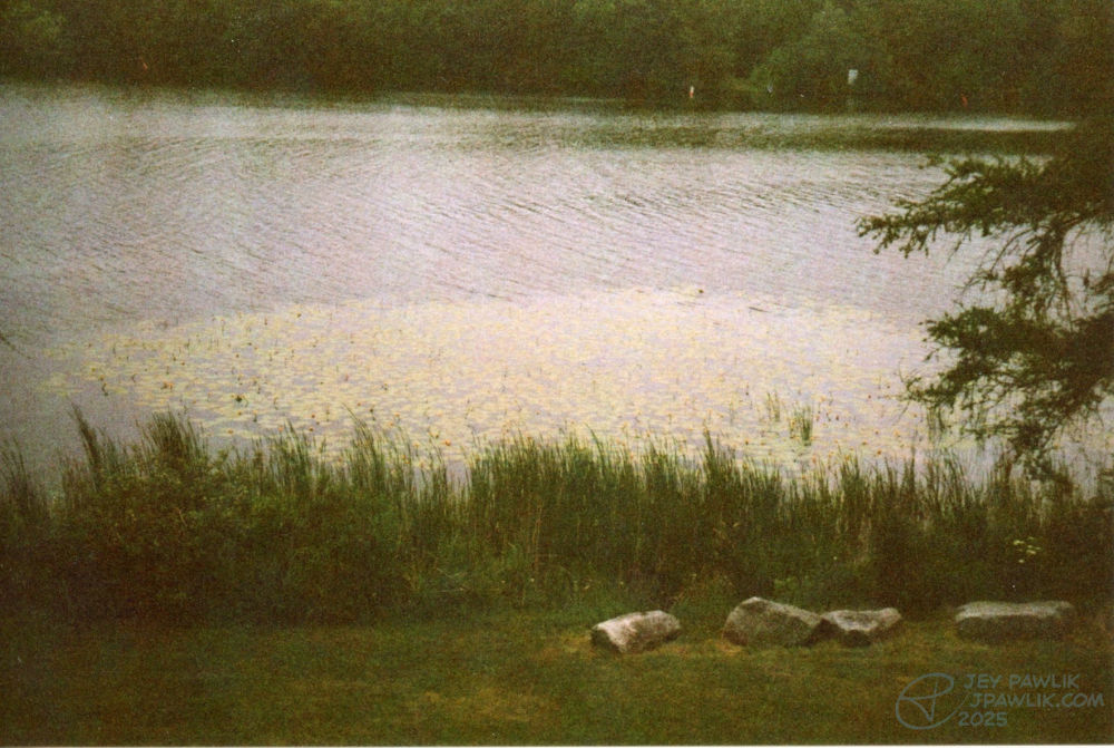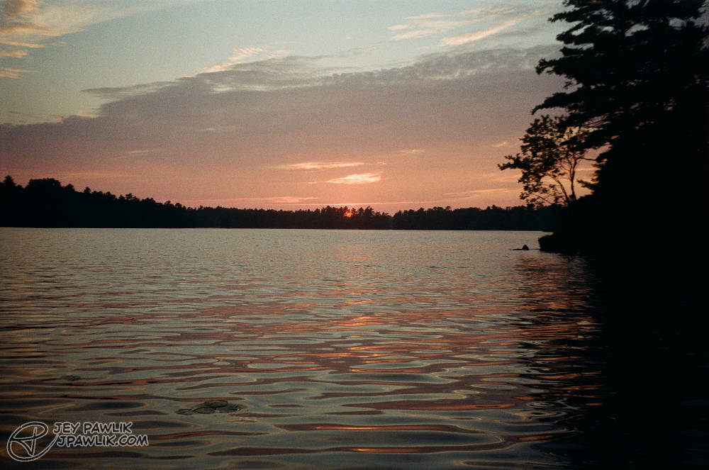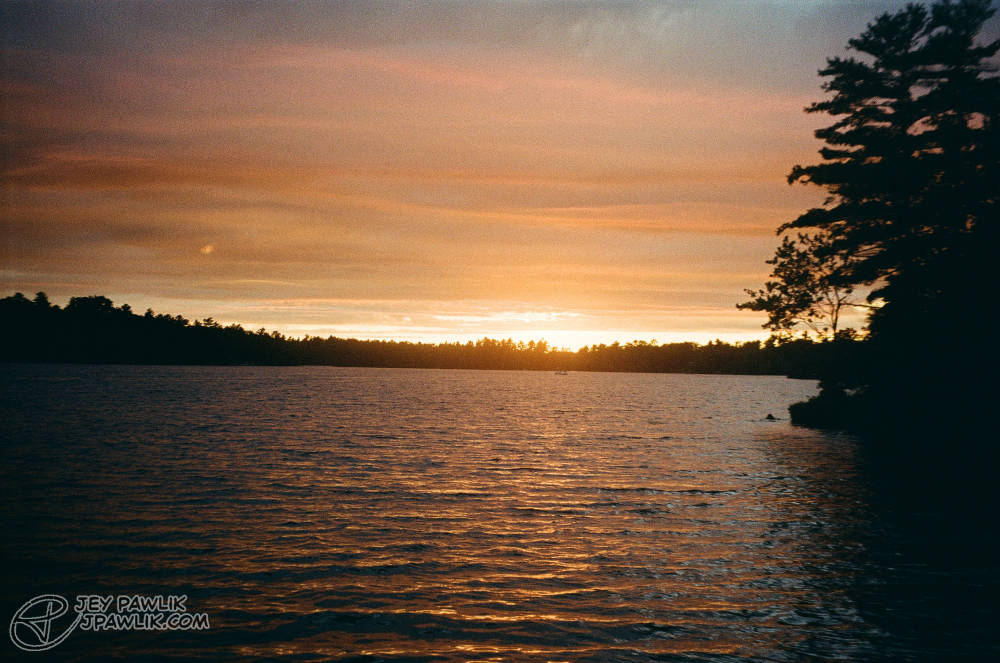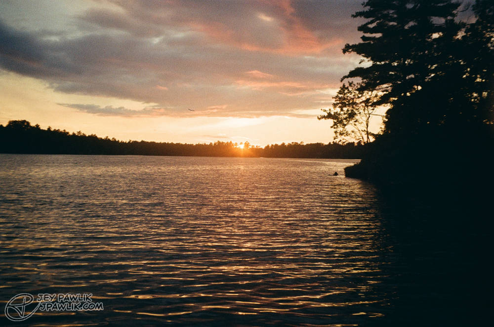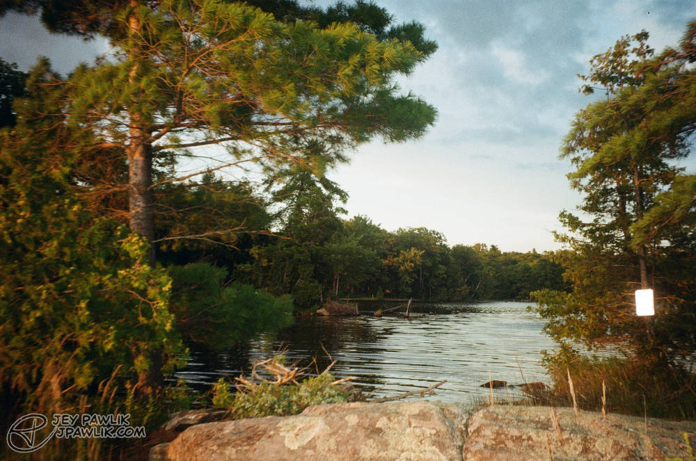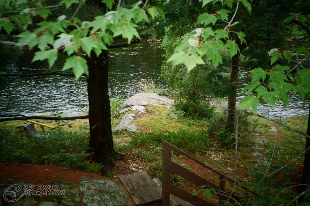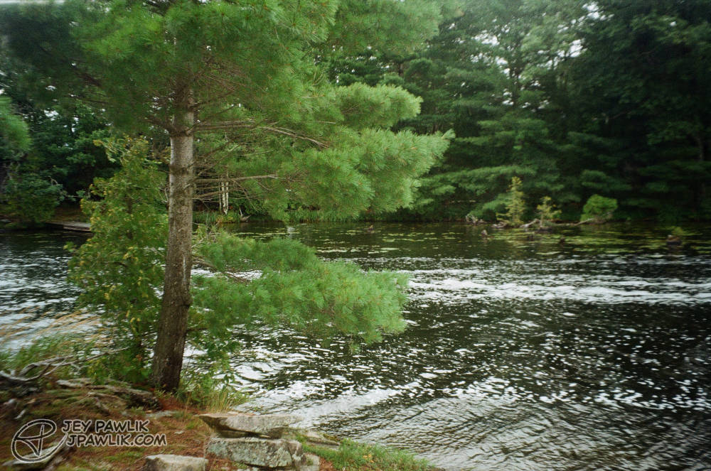 Colour film photo of a lake up in Port Severn. It's very overcast and the trees came out very dark.