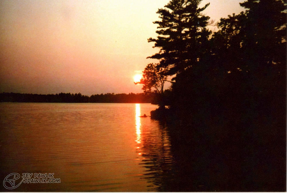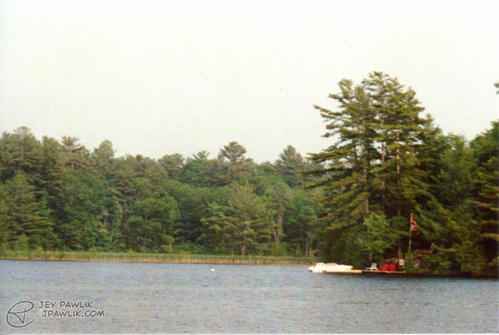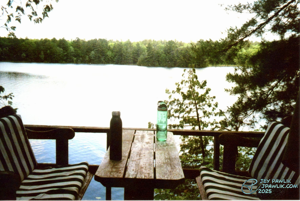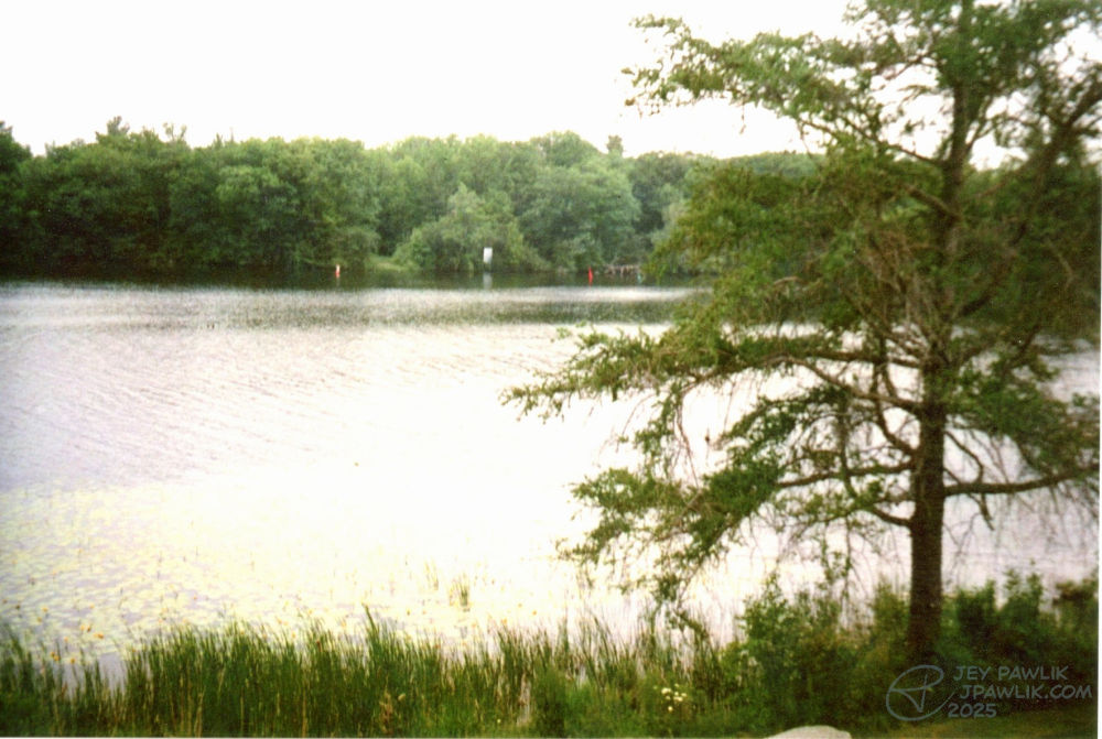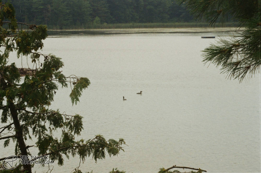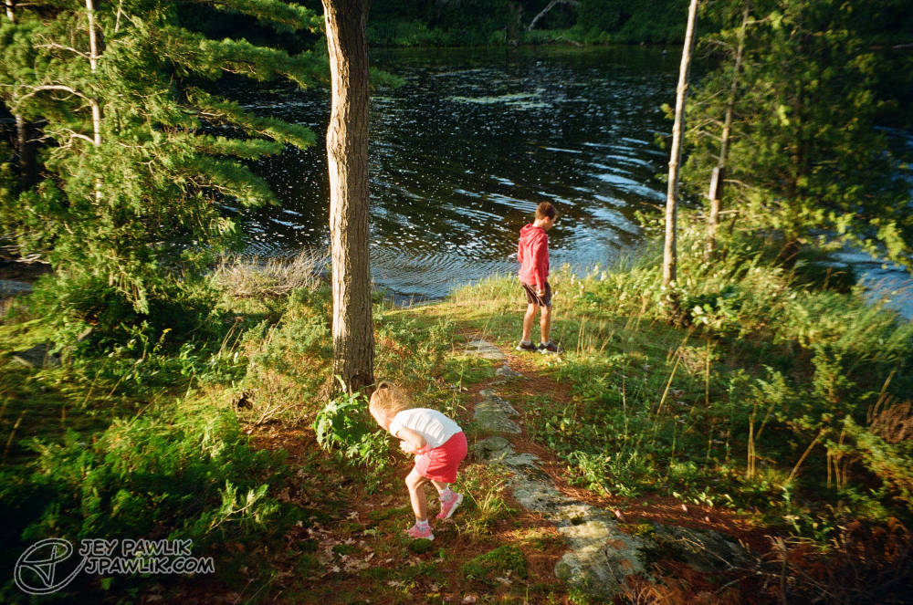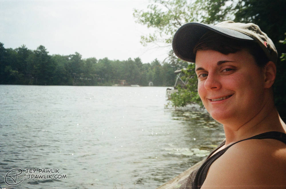 Colour film photo of a lake up in Port Severn. It's very overcast and the trees came out very dark.