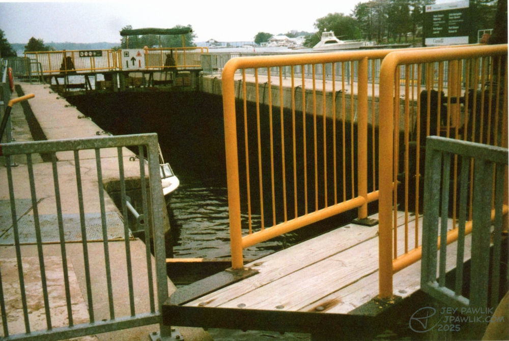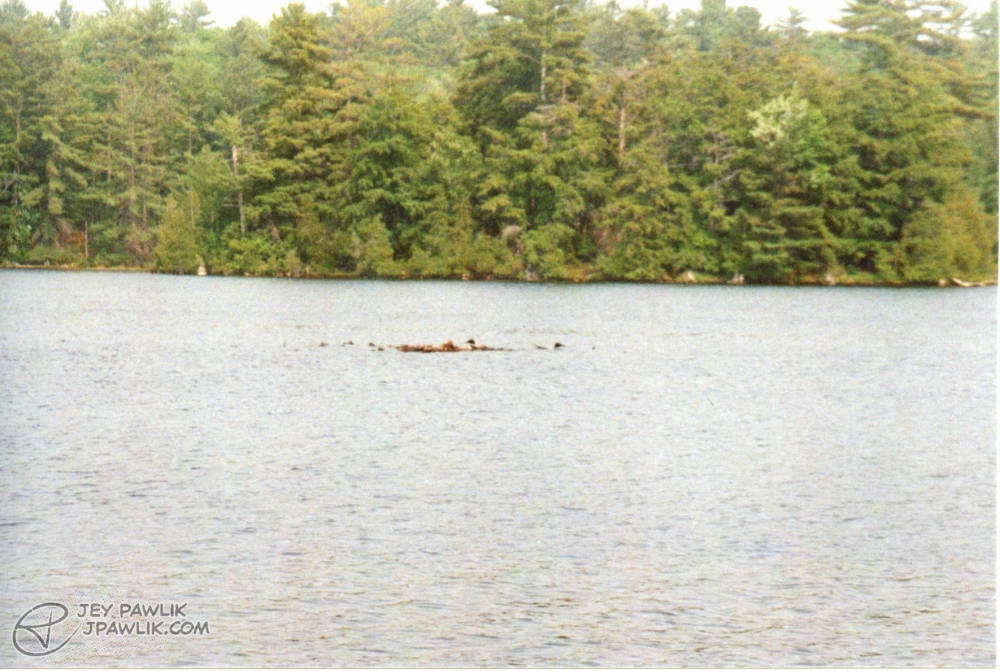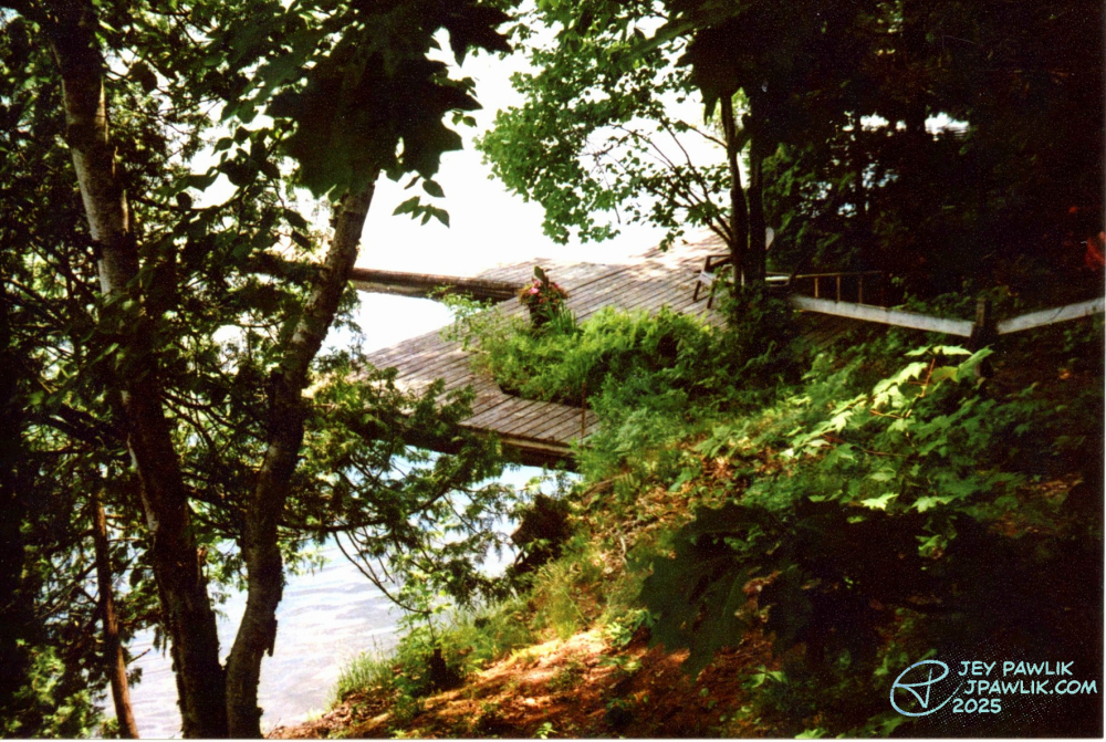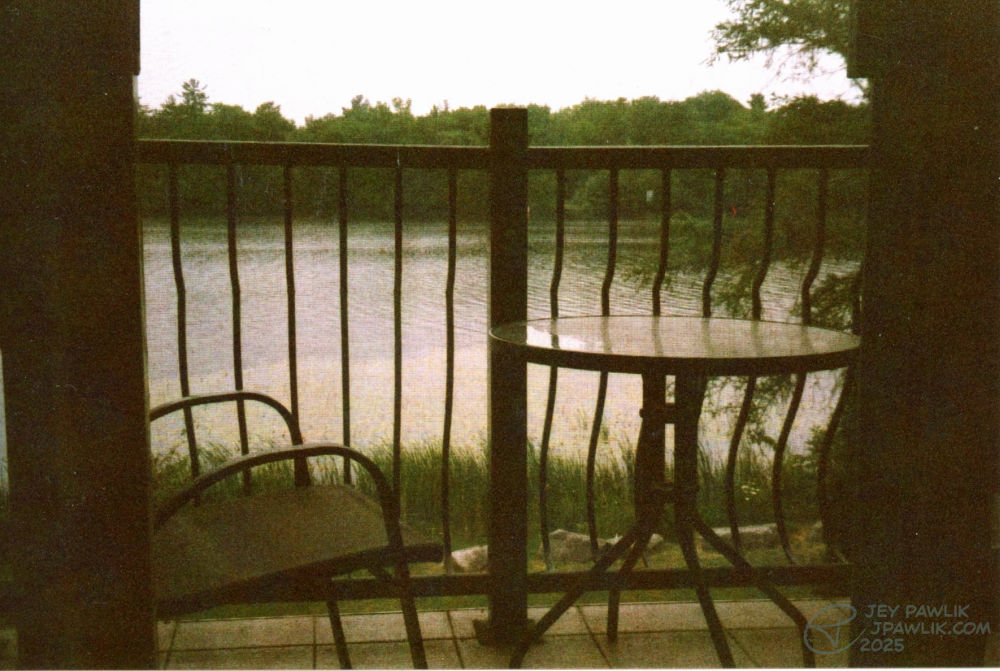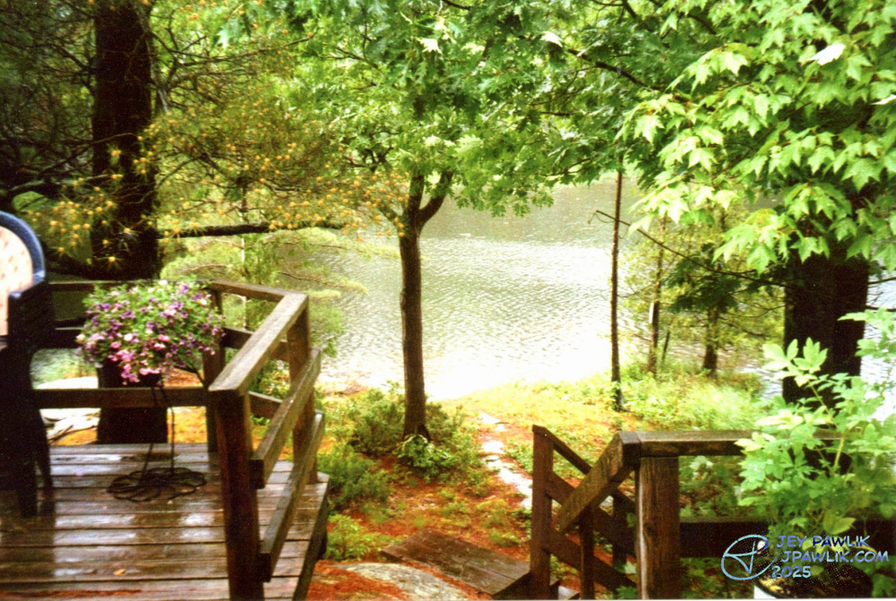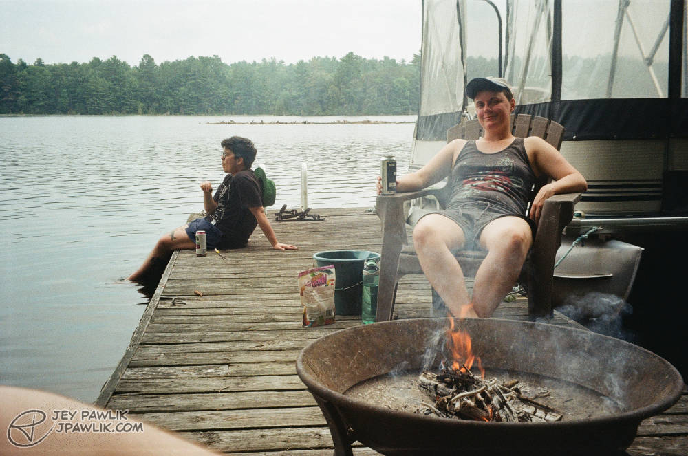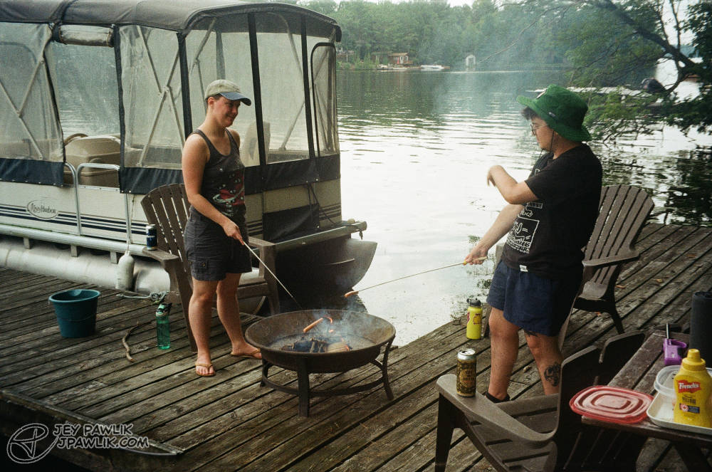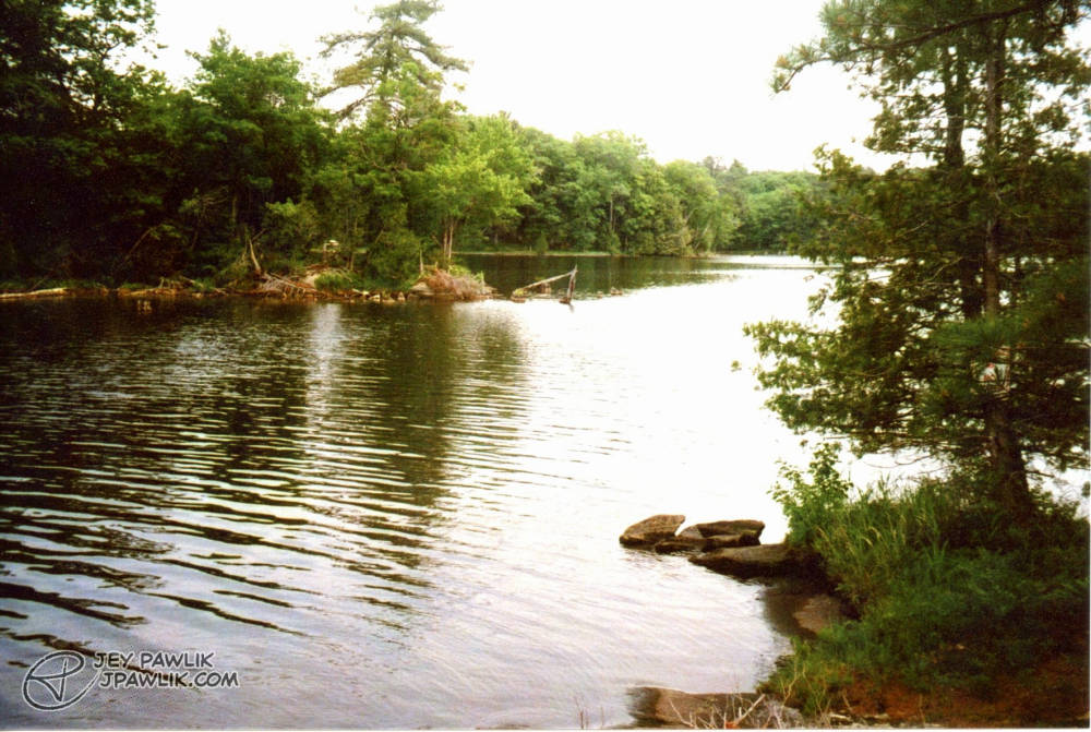 Colour film photo of a lake up in Port Severn. It's very overcast and the trees came out very dark.