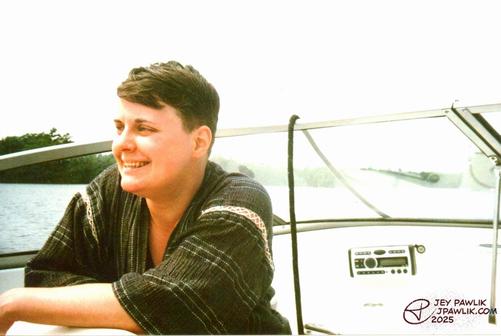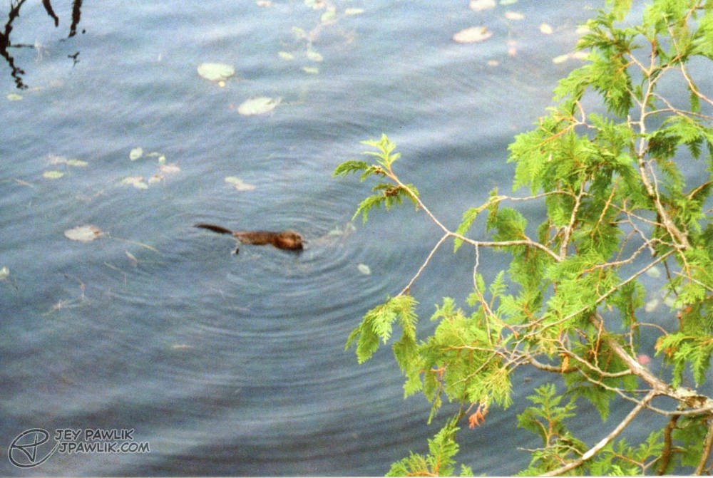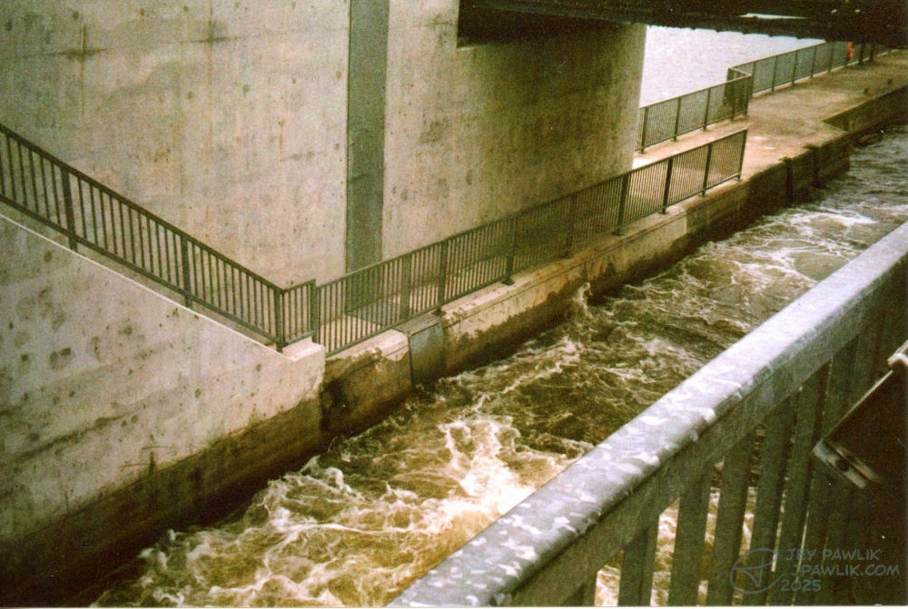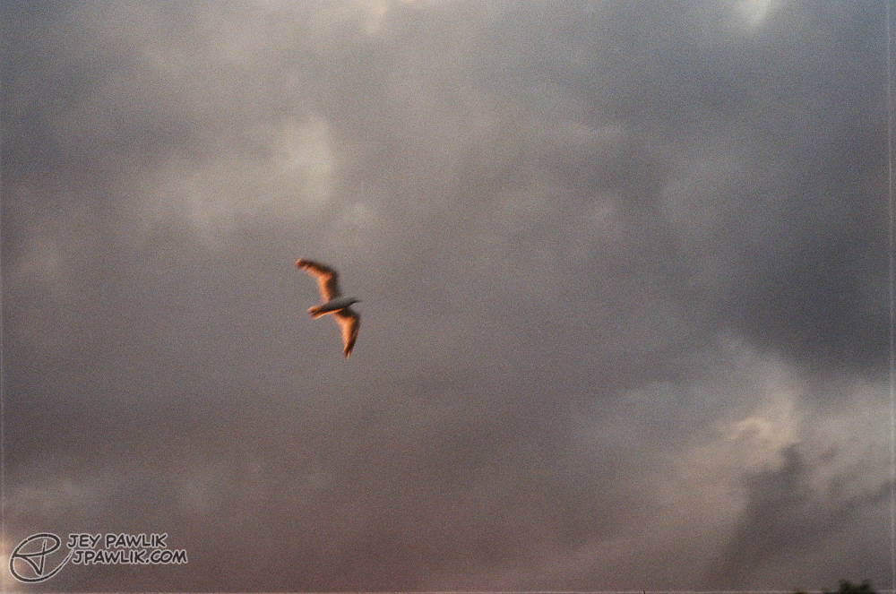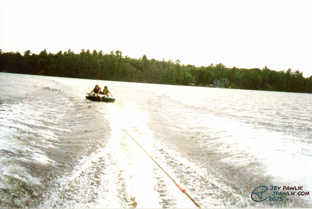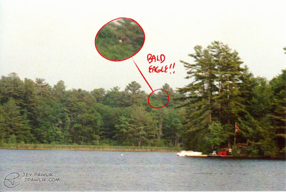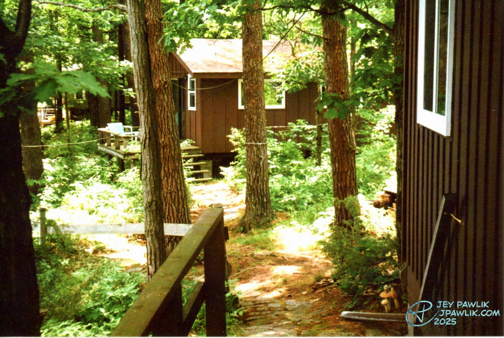 Colour film photo of a lake up in Port Severn. It's very overcast and the trees came out very dark.