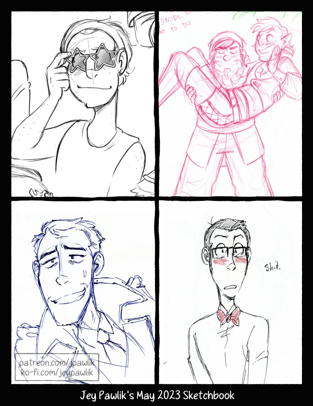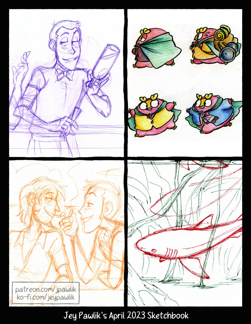 This month’s public art! I try my darndest to post something publicly every Friday – and all patrons get to see these like a month early! All of these can be seen & shared on my various socials: tumblr, twitter, mastodon, cohost, pillowfort, bluesky and jpawlik.com/blog!