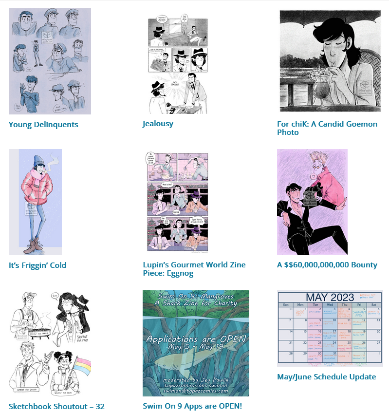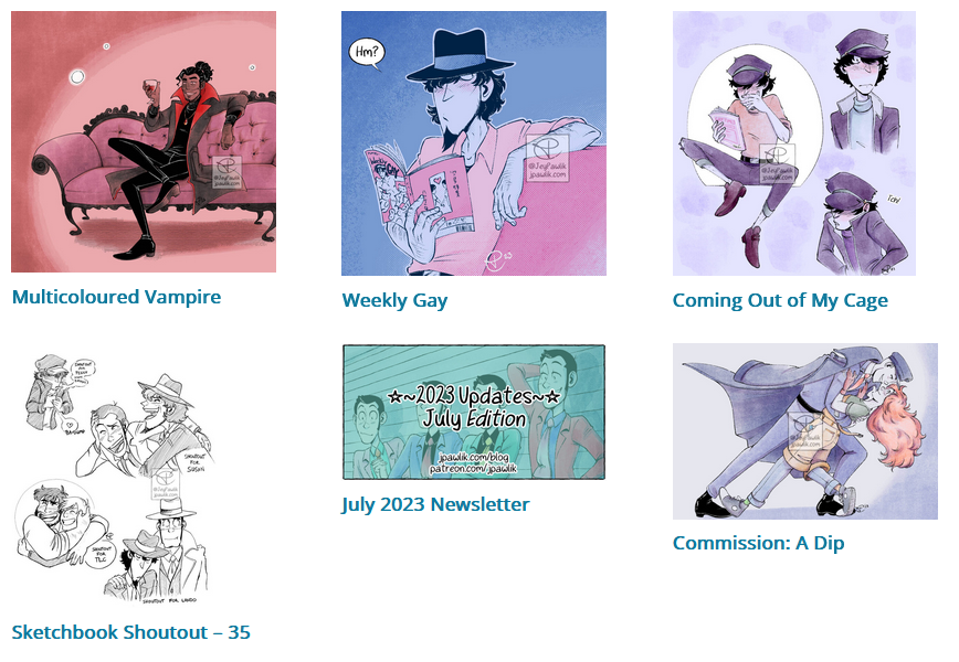 The Grab Bag tier on Patreon got a few more pages of my Lupin III fancomic “The Curtain Falls”, a comic about Lupin in his 60s. Pages go up when I finish them but it’s usually every other Wednesday.