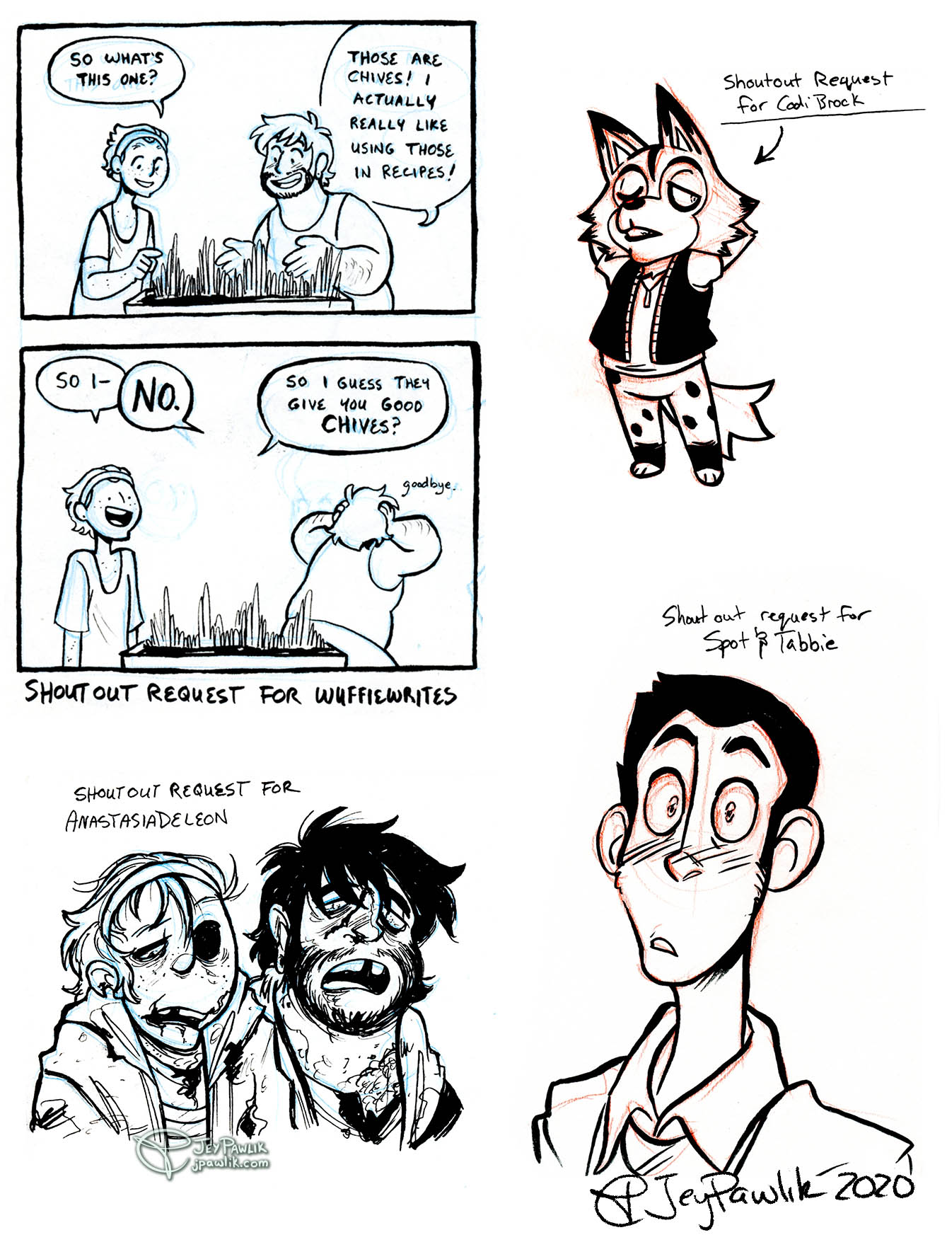 This year on Patreon I’ve been doing shoutout requests every month. How it works is every month a $10 patron can DM me with a small request, it can be Mikael and JP, the patron’s OC, fanart of other fictional characters, etc. Then I’ll draw it up and it’ll appear in my sketchbook pdf for them for that month. It’s been a lot of fun to see what people will ask me to draw and brings me out of my comfort zone a little.