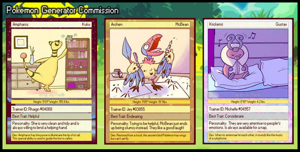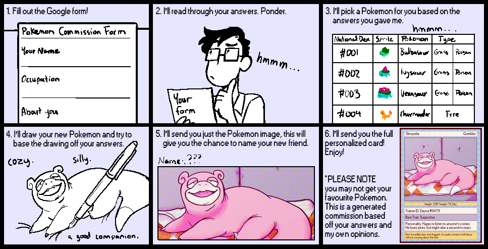 I’m opening up a new kind of commission where you can answer a few questions about yourself and I’ll pick and draw you a Pokemon that I feel best represents your answers!