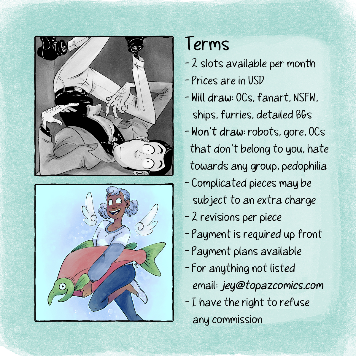 If you want something not listed or would like to inquire about commercial art please email me at jey@topazcomics.com