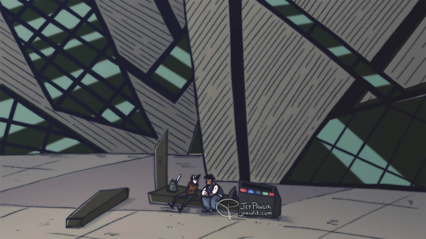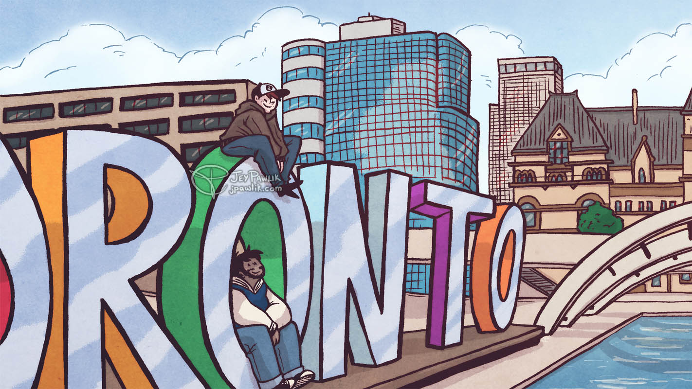 Nathan Phillips Square is iconic and was a lot of fun to draw. Mikael likes to sit on things.