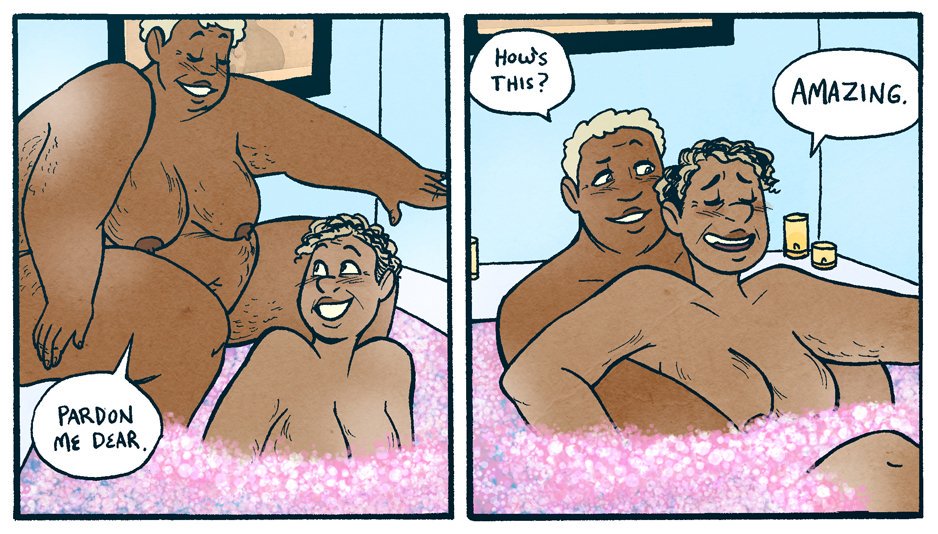 Our newest comic for @filthyfigments just wrapped up! “After Practice” is a 19-page story about two older lesbians who come home to a relaxing bath after flag football practice!
