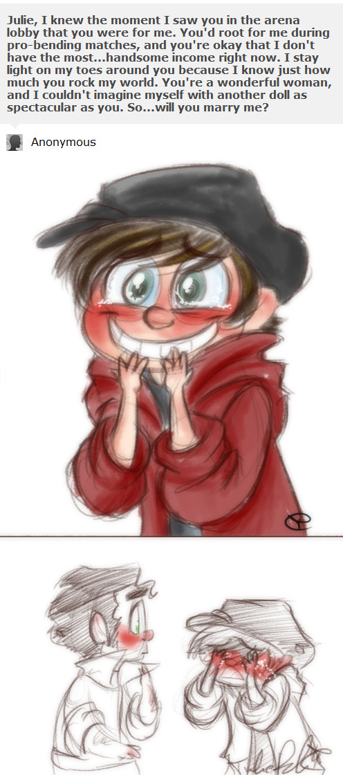 A commission for Yepa for a birthday present. It isn’t as lovey as I hoped, but I just couldn’t redo Korra’s pose here, it worked too well. Also Tahno is hard to draw.