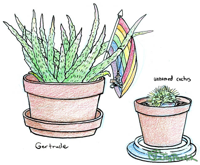Michelle’s big aloe, Gertrude, and a cactus pup I planted but I’m not sure how well it’s going to do. I don’t have much of a green thumb but I’m trying! If it lasts a while I might give it an old lady name to match our other plants!