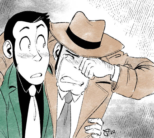 A redraw from the Lupin Y Manga, which while it’s not translated into English, is an absolute delight. The art is some of my favourite in the franchise and it’s very Zenigata focused. So anywho, look at these charming gays in separate hot springs who’re clearly thinking about one another.