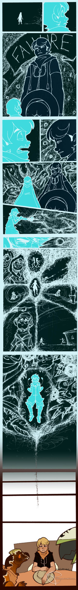 This comic is really blah. I don’t like much about it, and inverting it was actually a mistake, but I liked how it looked, so it stuck. Also drawing the creepy ass dinosaurs… ohman, fuckin’ creepy. But I think it works, since Nel’s power is to control them, and no one should be able to in the first place, so there is worry in the back of his mind all the time, that it might backfire and he could just be swarmed and eaten. Why is this so much darker than I intented it to be? I don’t know. Well, I’m done. And I’ll try and move on to fix my art block (if anyone has any tips, feel free to help).