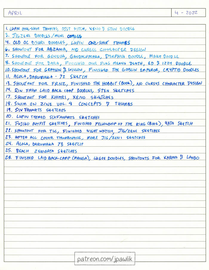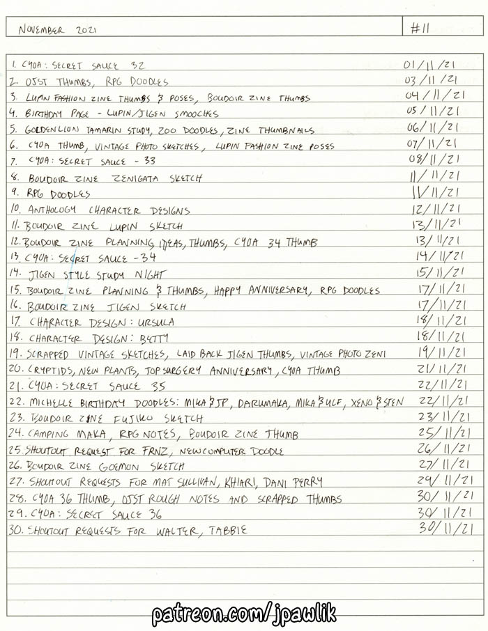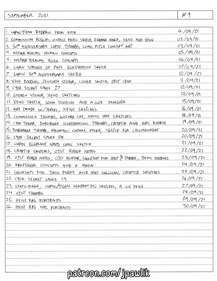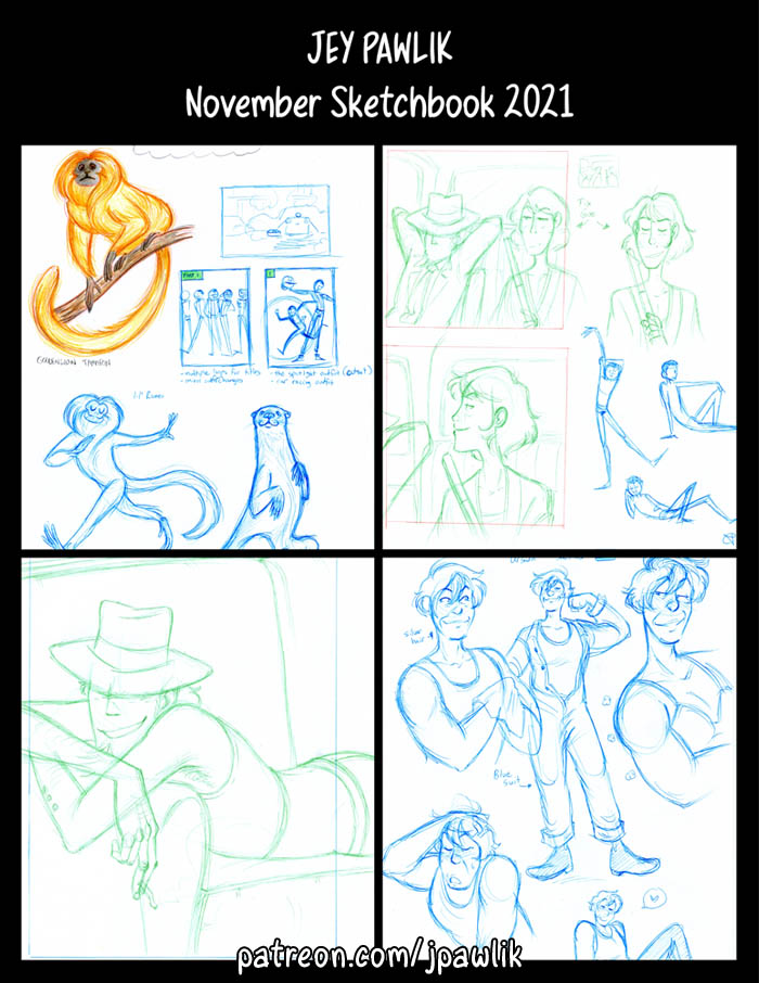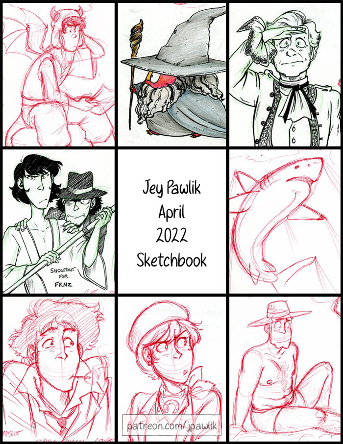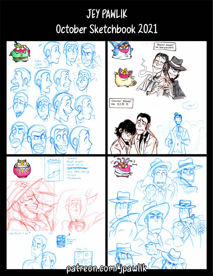 Here’s this month’s sketchbook, there’s some comic concepts, thumbnails, character designs and of course lots of Lupins. This month’s $10 shoutouts were a lot of fun!