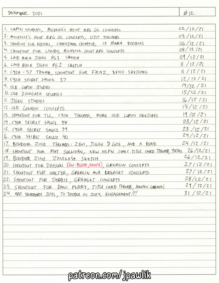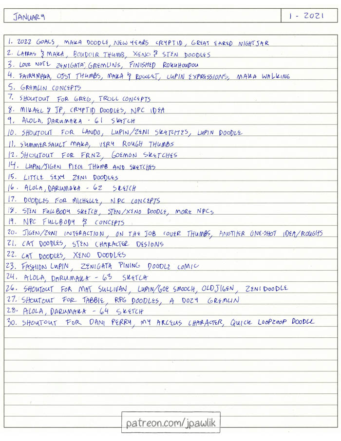 My January sketchbook is up! This month’s got just so much Lupin, some gremlin concepts, OC concepts, some OJST thumbnails and of course a bunch of $10 patron shoutouts.