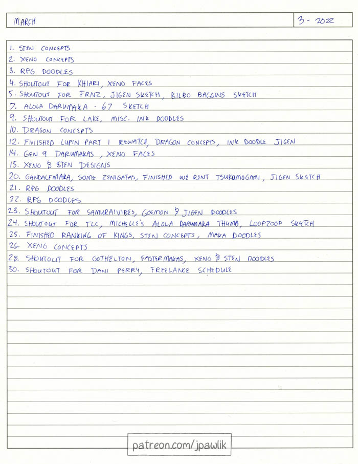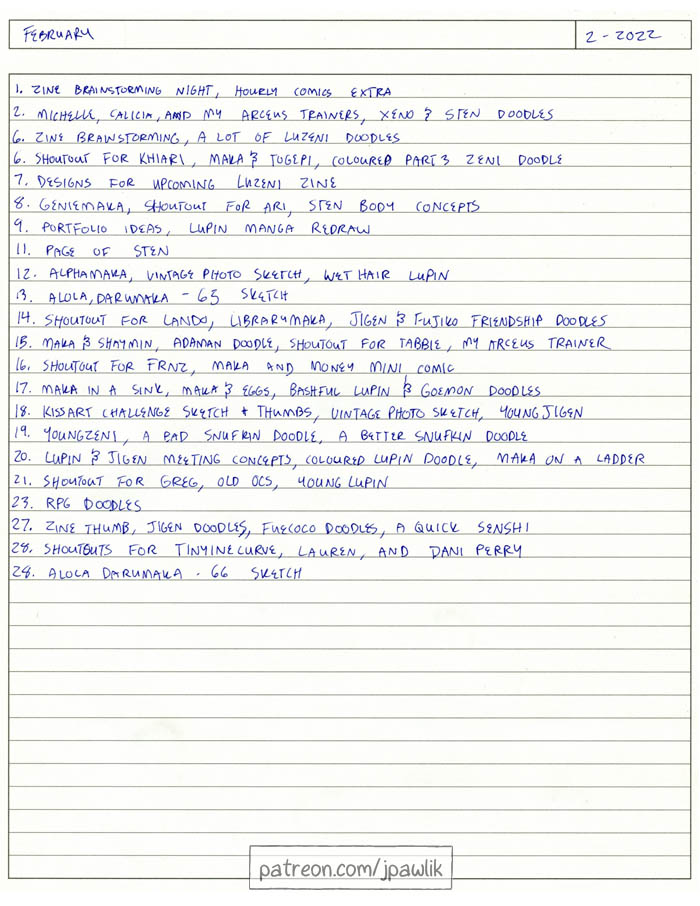 Here’s February’s sketchbook! There’s lots of goofy doodles in this one, concepts for the luzeni zine that Michelle and I are doing a 4 page comic for, lots of Darumakas and patron shoutout requests!.
