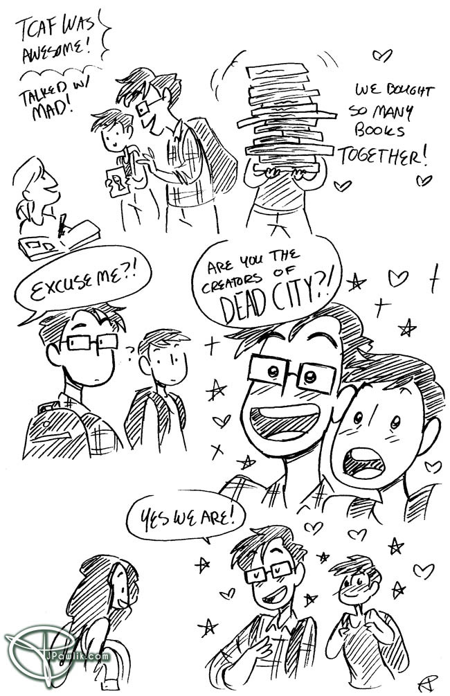 Went to TCAF, it was amazing. This is essentially what the Saturday was like for me. Met EK Weaver (bigbigtruck) and Katie Tiedrich (awkwardzombie). Got a buncha books. We were giving out small copies of Skargarden and Dead City, so I hope people liked them! Also got a super awesome commission from bigbigtruck and it was the best thing ever.