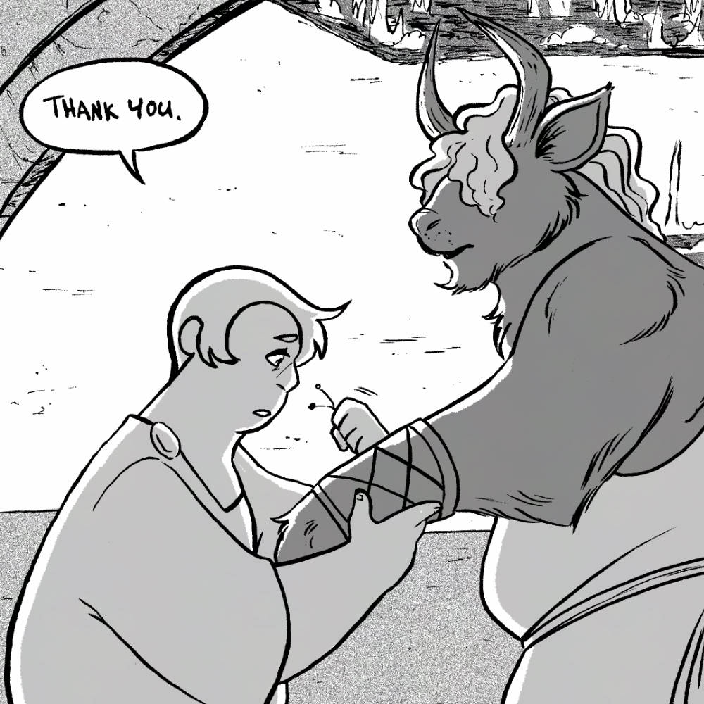 A minotaur and his husband tend to their garden in the center of a labyrinth are interrupted by the call of sacrifice. A 6 page comic in Bear Company 2: A Gay SFF Zine featuring fat masculine people.