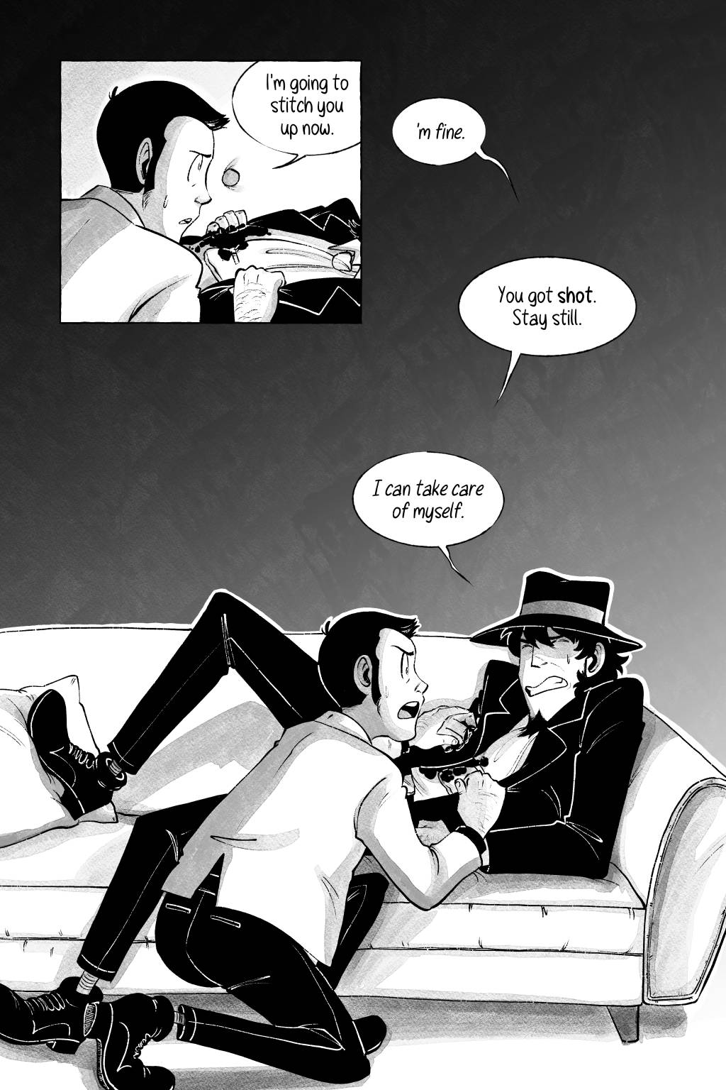 Early in their partnership, Jigen is shot and when Lupin tries to help he discovers something he didn’t know about his partner. Unsure of how to react Lupin falls into old habits and is surprised when it doesn’t work out as planned. A 16 page comic originally posted on Patreon.