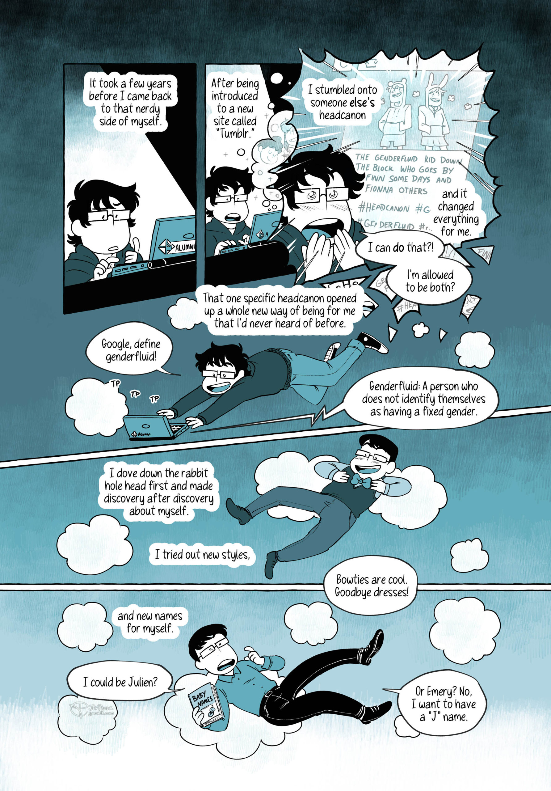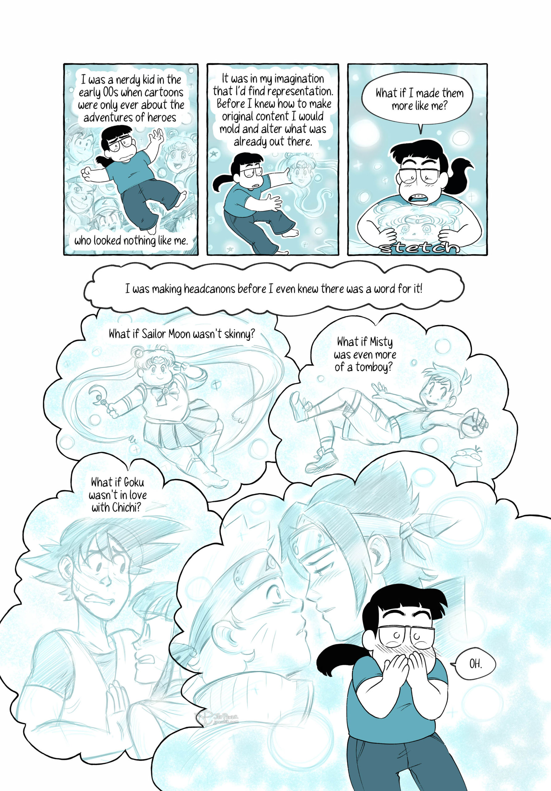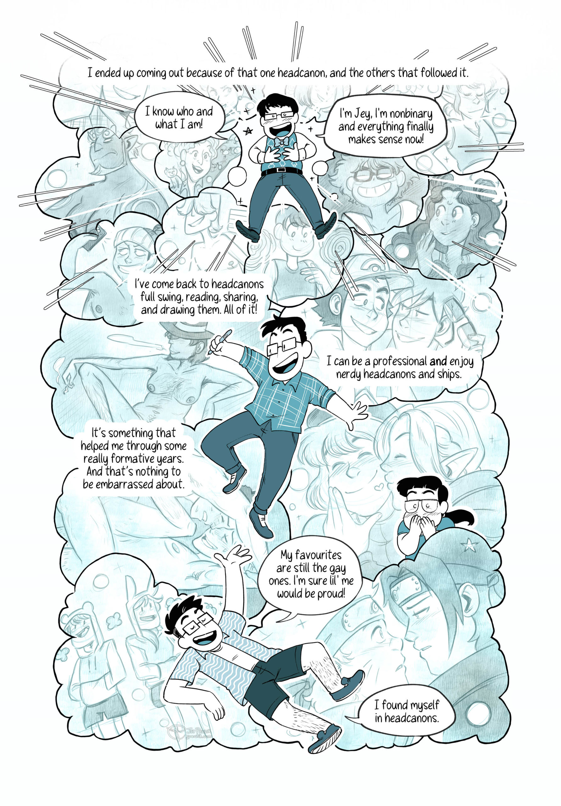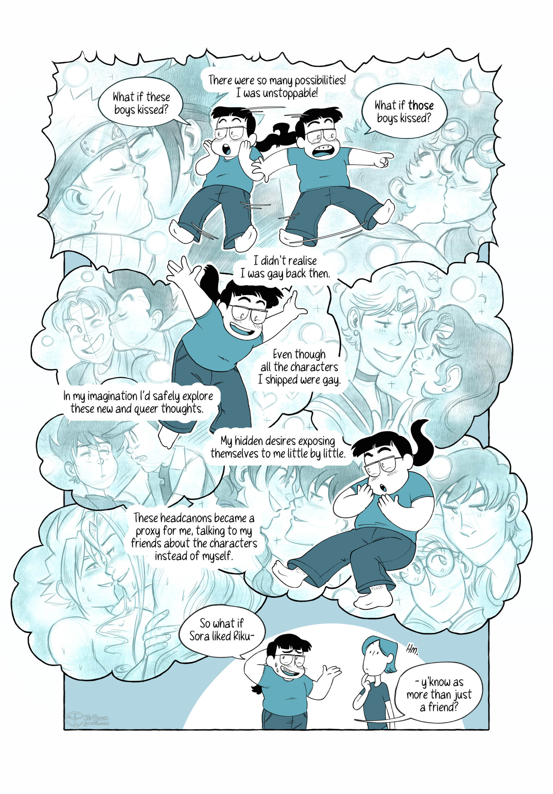 “What if *these* boys kissed? What if *those* boys kissed?” A 5 page autobio comic of when I unlocked the power of headcanons, nothing in my life would ever be the same.