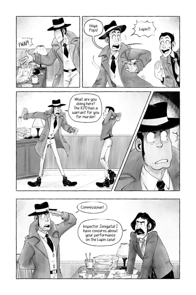 Lupin pops into Zenigata’s office for a surprise. But once he’s there things get a bit out of hand in this 8 page comic.