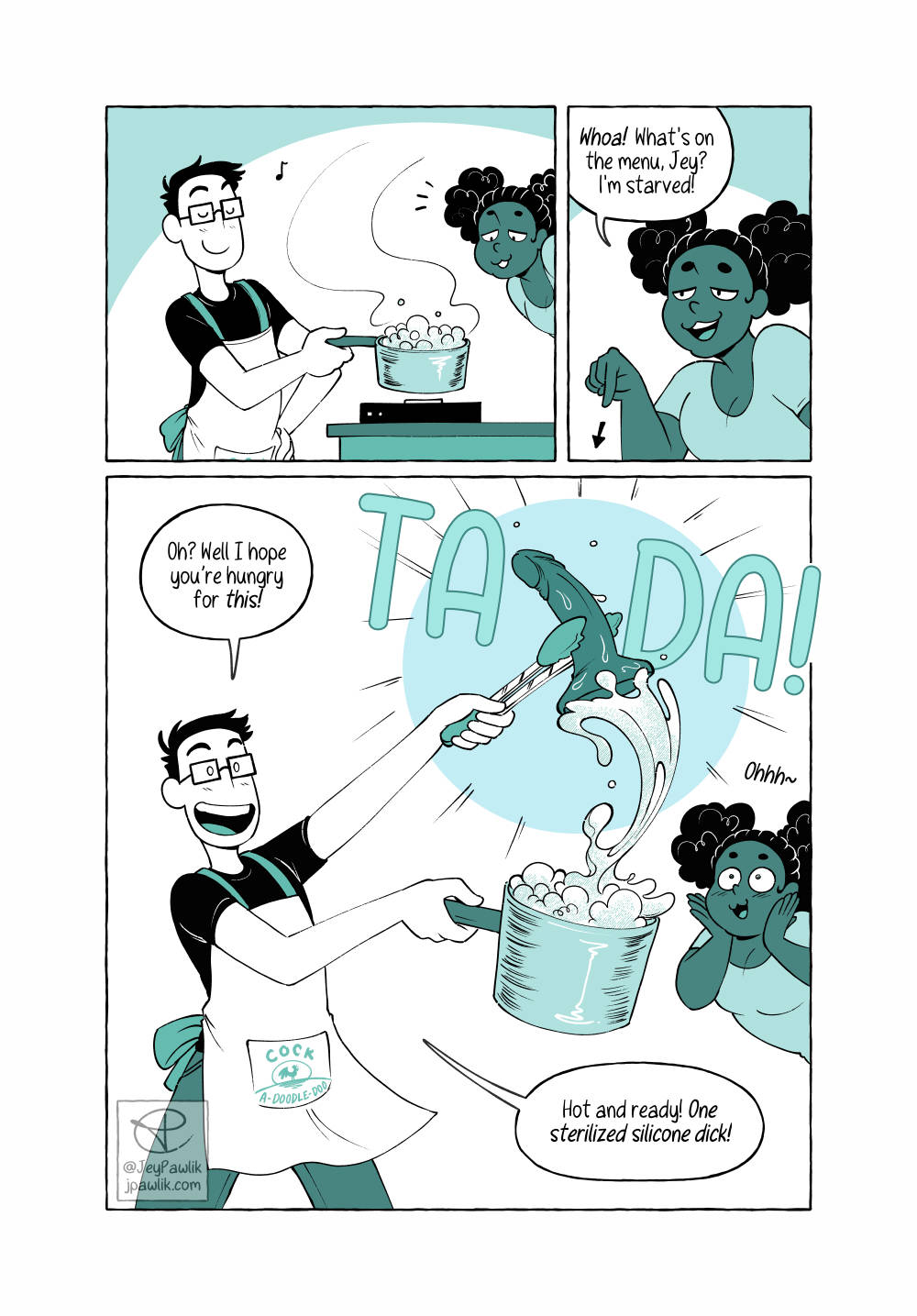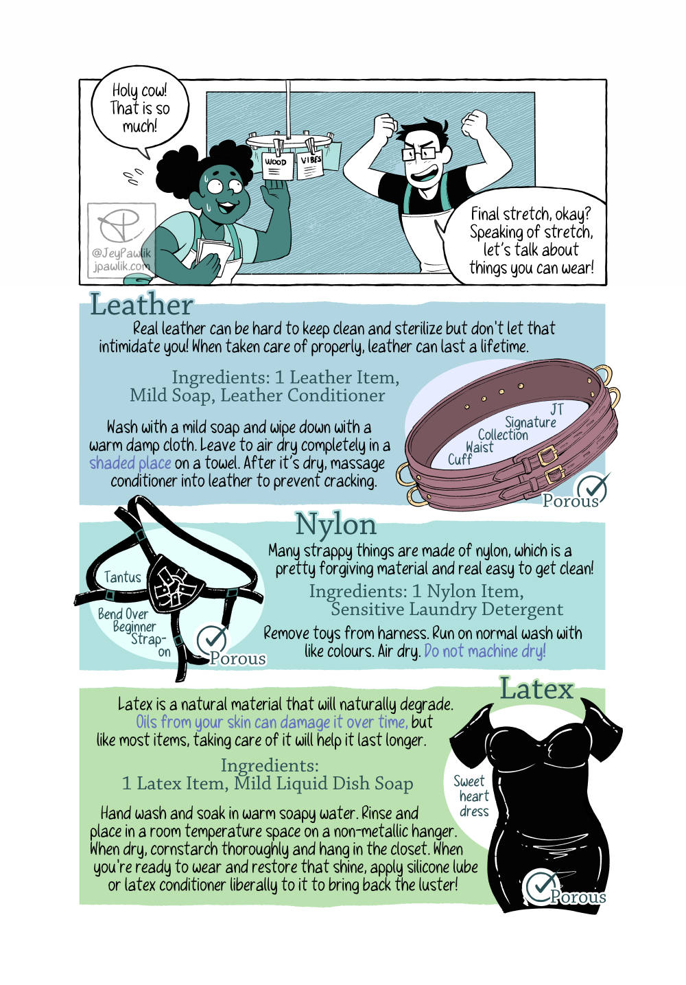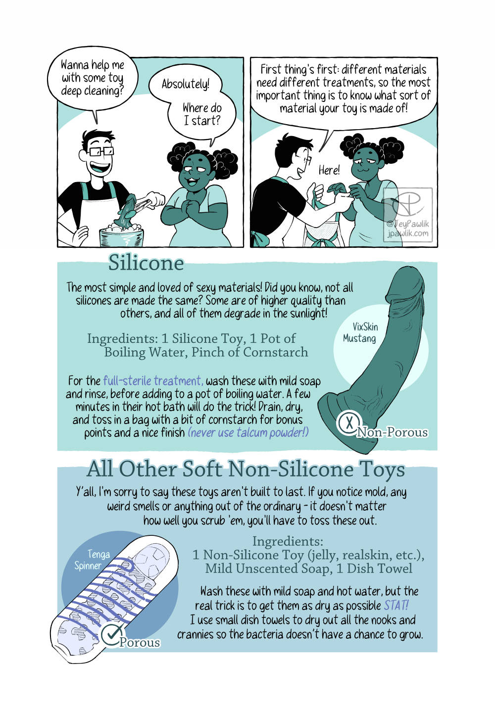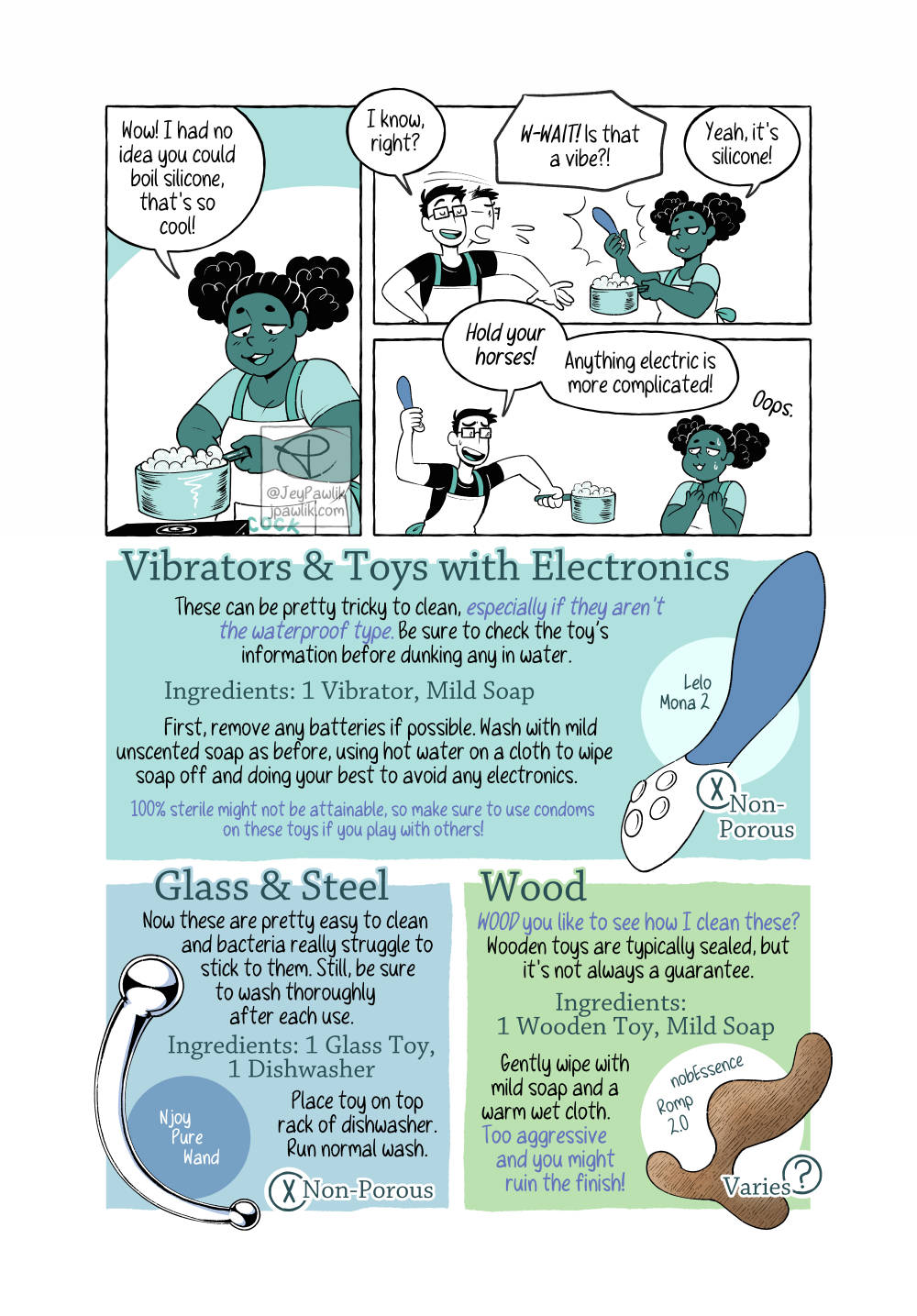 Let’s learn how to clean your collections today! Have you ever wondered the best way to clean each type of toy? Never fear because with these handy recipe cards you’ll always be able to come back and check the basics. A 5 page comic for Oh Joy Sex Toy.