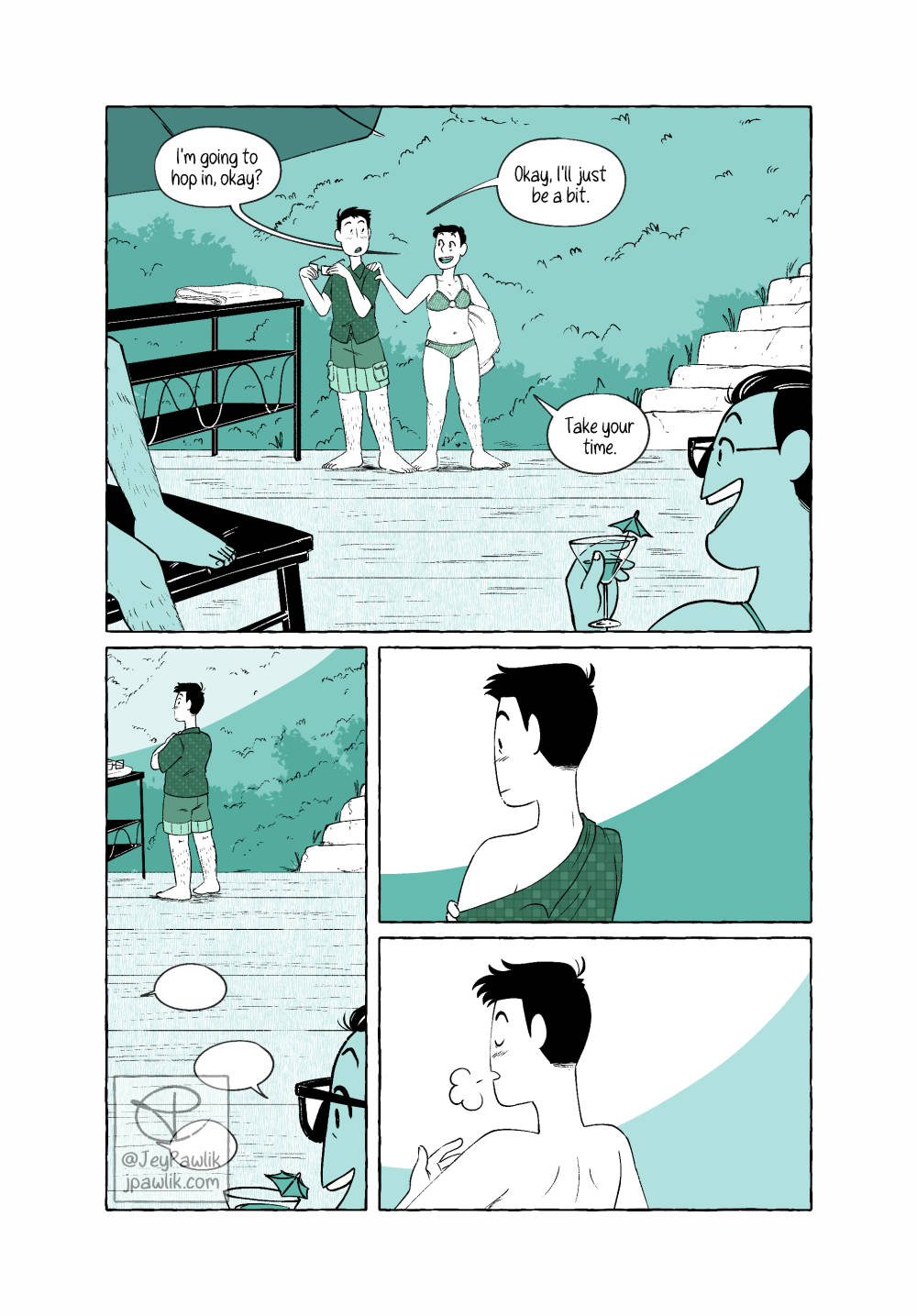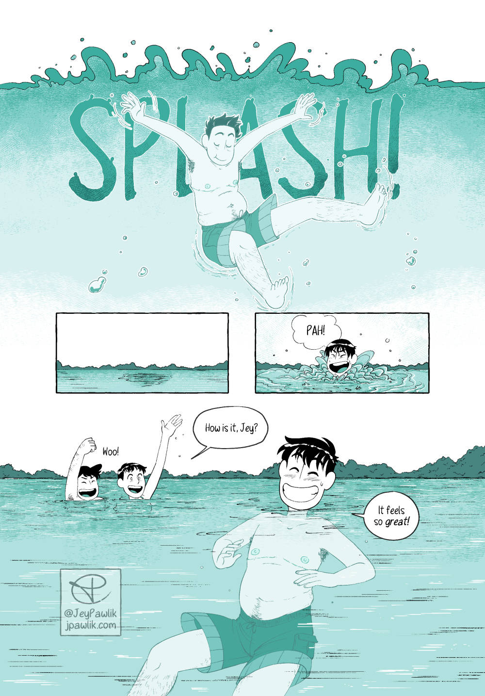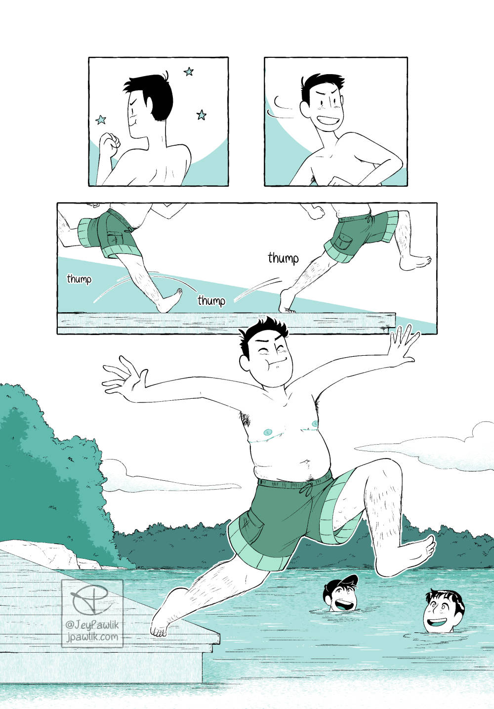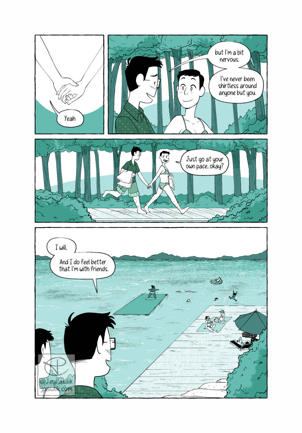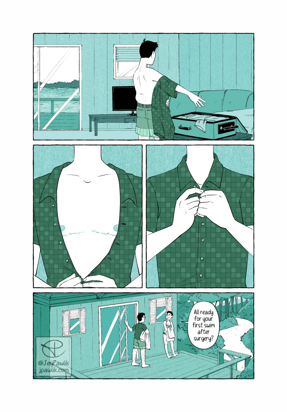 A little story of the first time I went shirtless in a public space after my top surgery. It was a great moment for me, even if my chest was still too numb to feel the water. A 5 page comic for Oh Joy Sex Toy.