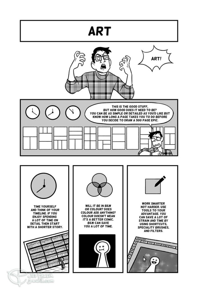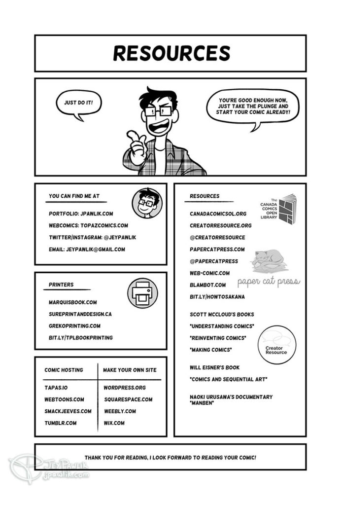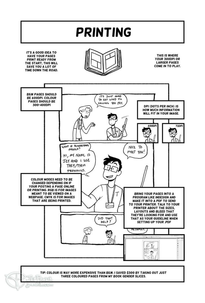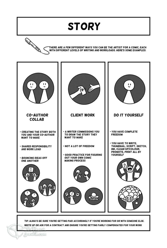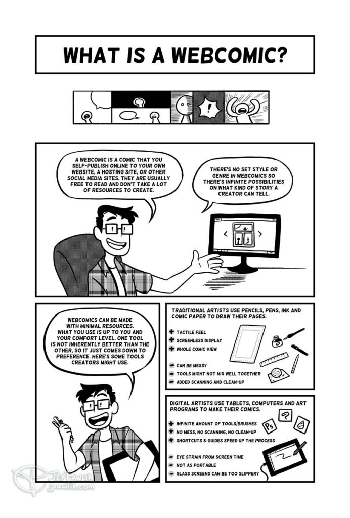 A 9 page Scott McCloud-style narrative for those looking for comics-related reading material, how-to guides, or an introduction to webcomics! The comic was adapted from Jey’s artist talk and workshop at the Canada Comics Open Library.