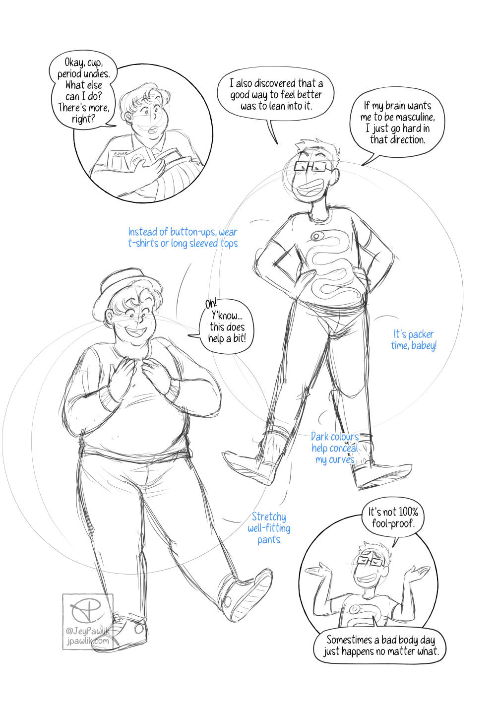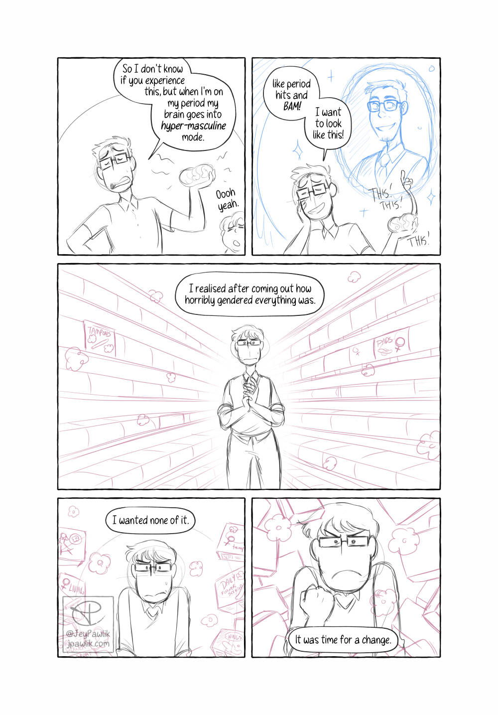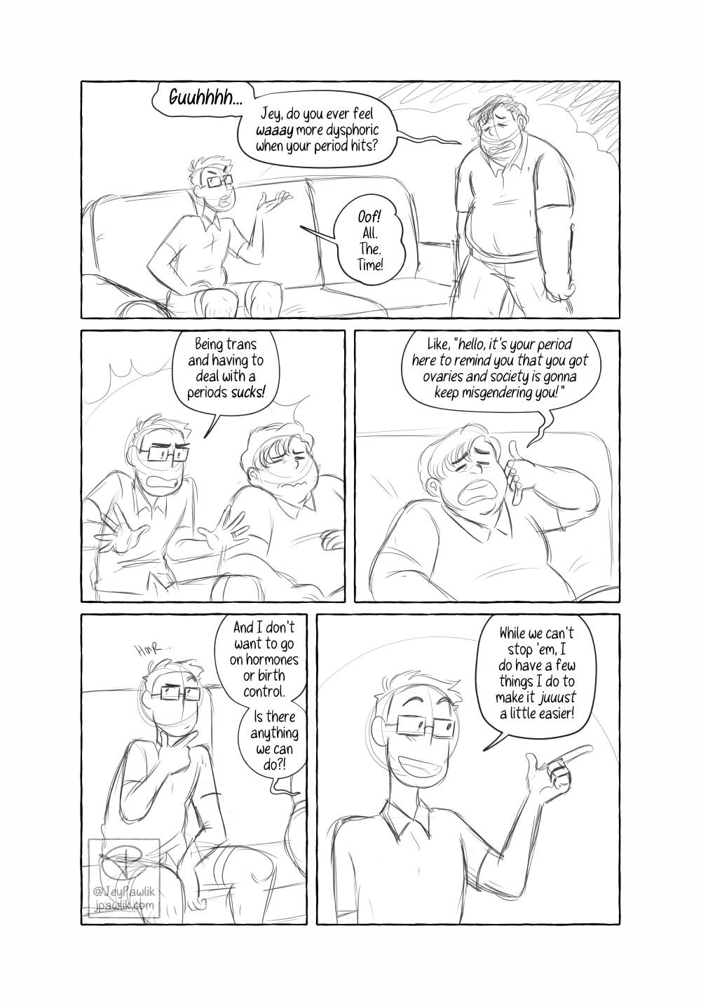 Today’s Behind the Scenes is from Navigating Menstruation While Trans. Which is written specifically for folks who still experience their periods. At the time I wasn’t on HRT, or wasn’t really planning on it, so it’s written from that perspective. Now I’m on T but I’m not far enough along yet for my body to be rid of this monthly issue. BUT SOON (hopefully)!