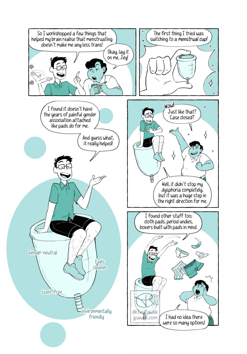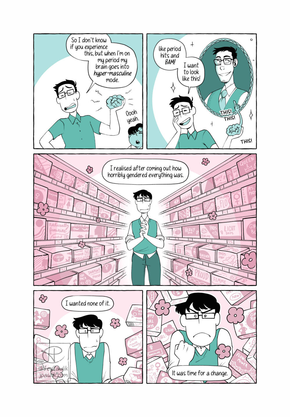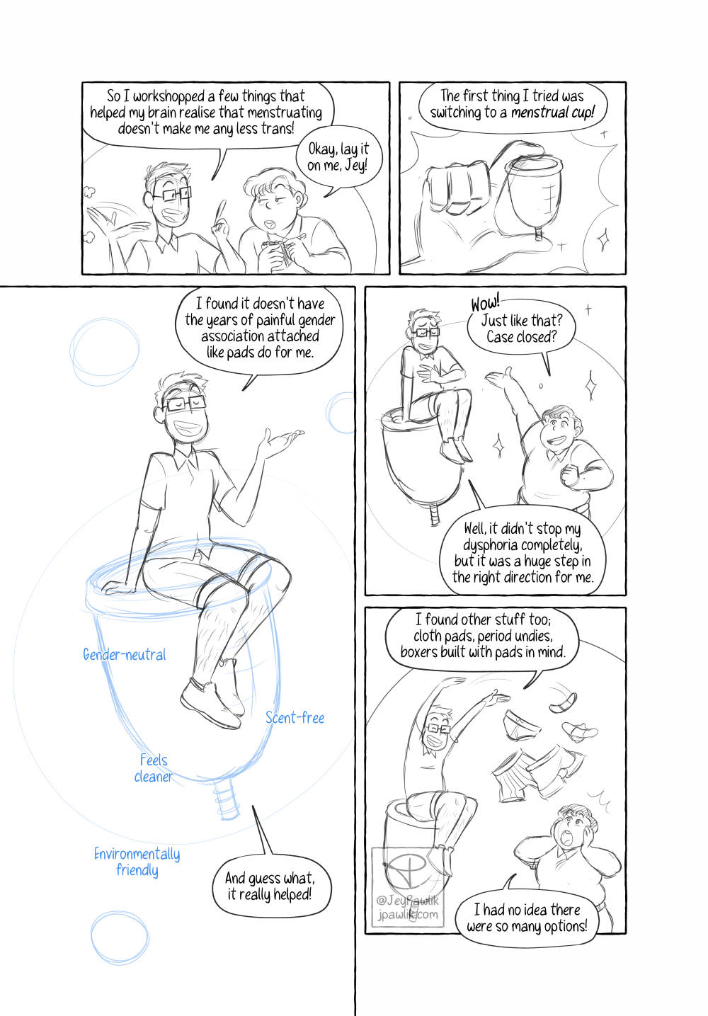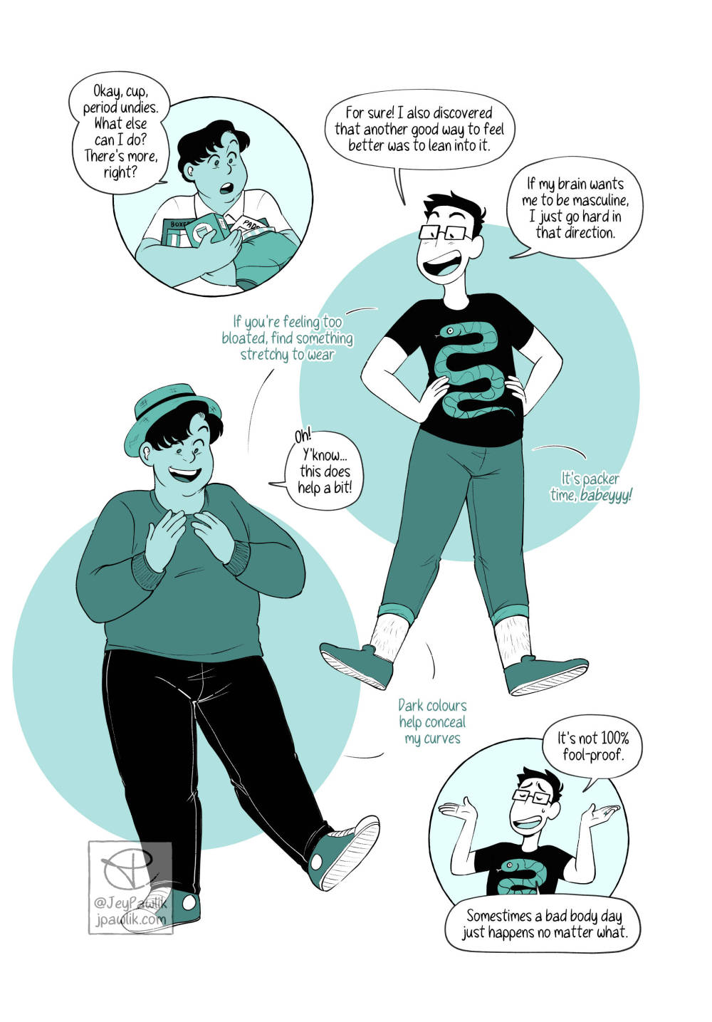 Today’s Behind the Scenes is from Navigating Menstruation While Trans. Which is written specifically for folks who still experience their periods. At the time I wasn’t on HRT, or wasn’t really planning on it, so it’s written from that perspective. Now I’m on T but I’m not far enough along yet for my body to be rid of this monthly issue. BUT SOON (hopefully)!