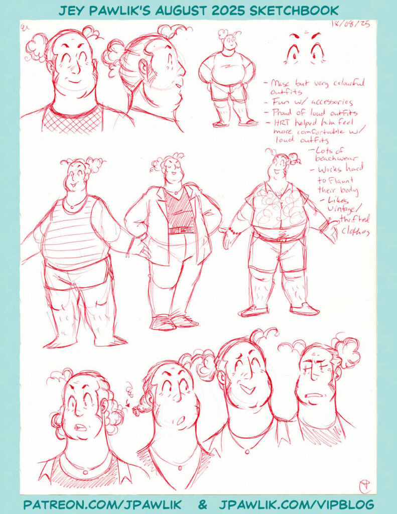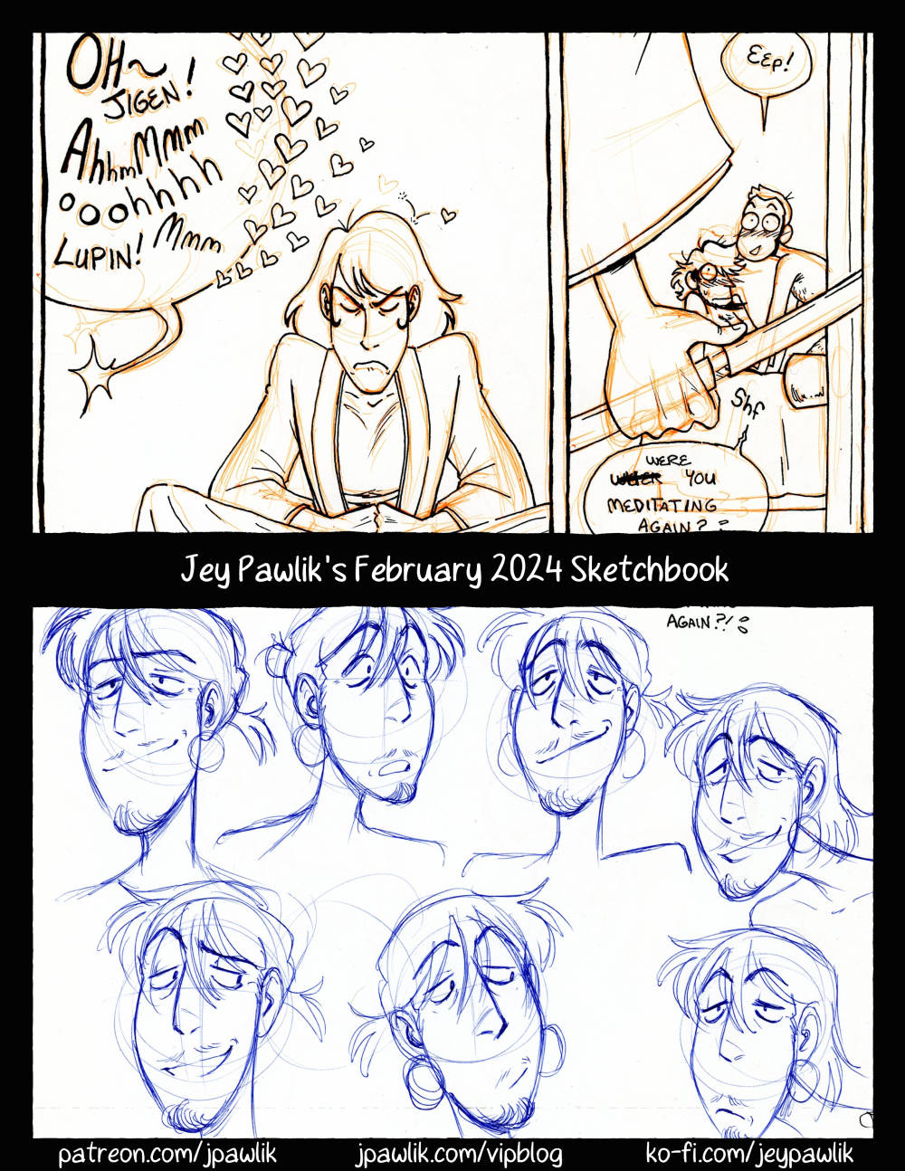 Another almost 30 page sketchbook, I’ve been really feeling it lately! I’ve got some projects on the go, like finishing up the art for a Lupin Boudoir zine by myself, Max, and my good friend Amiel – hopefully more info on that soon! Working out some more original comic character designs, a bunch of fun Lupin doodles, and some very good shoutouts this month (thank you Private Collectors!)
