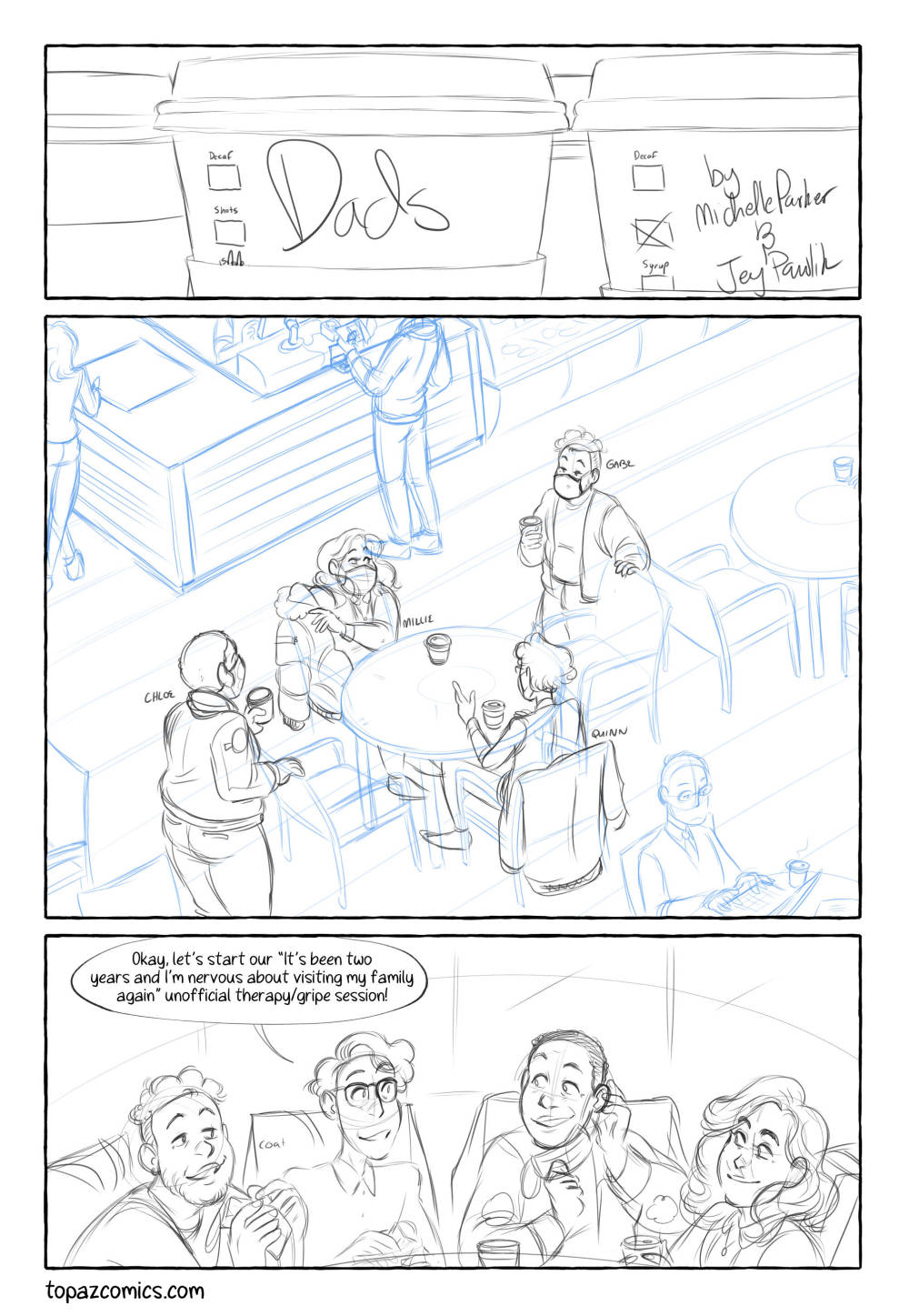 “Working from interviews was a very different starting point than how we typically create comics, and we really wanted to make sure that we stayed true to the stories that were passed on to us. Having a theme of compassion and seeing the interview responses connected with something that both of us experienced as queer people. Though it is certainly and thankfully not the case for everyone, but a common theme in the interviews was the way queer people try and connect with their homophobic parents. When we consider parent/child relationships a lot of time is spent on the parent’s unconditional love for their child, but a recurring theme in the stories of queer people is the continued desire to reconnect and love parents who are dismissive or antagonistic to their child’s sexuality. We hope that this comic expresses to the reader how much queer people love their parents, and the compassion they have where they try and connect however they can, even when those relationships hurt.” – Max Parker