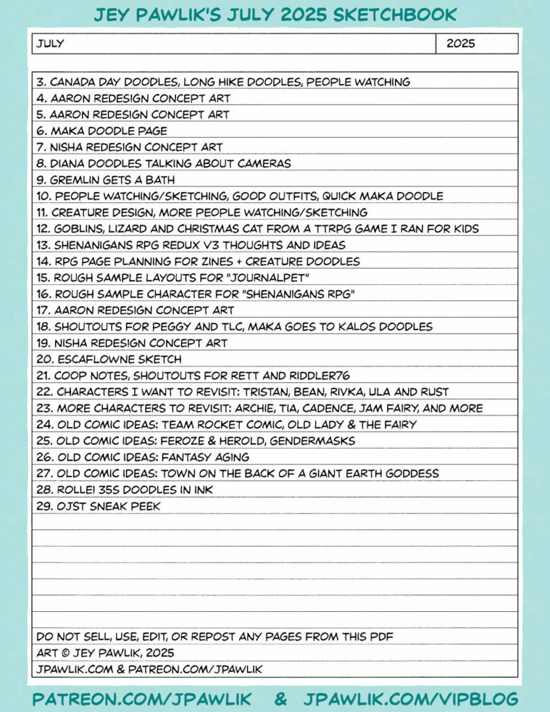 It was another busy month but I managed to get almost 30 pages done for the first time in a loooong time. I’ve got a lot of things on the go in this one: lots of redesigning old OCs, silly doodles, Cartoonist Coop work, TTRPG concepts, and going through some old sketchbooks to redraw some really old but fun designs and pitches. Plus of course, shoutout requests from my Private Collector folks!